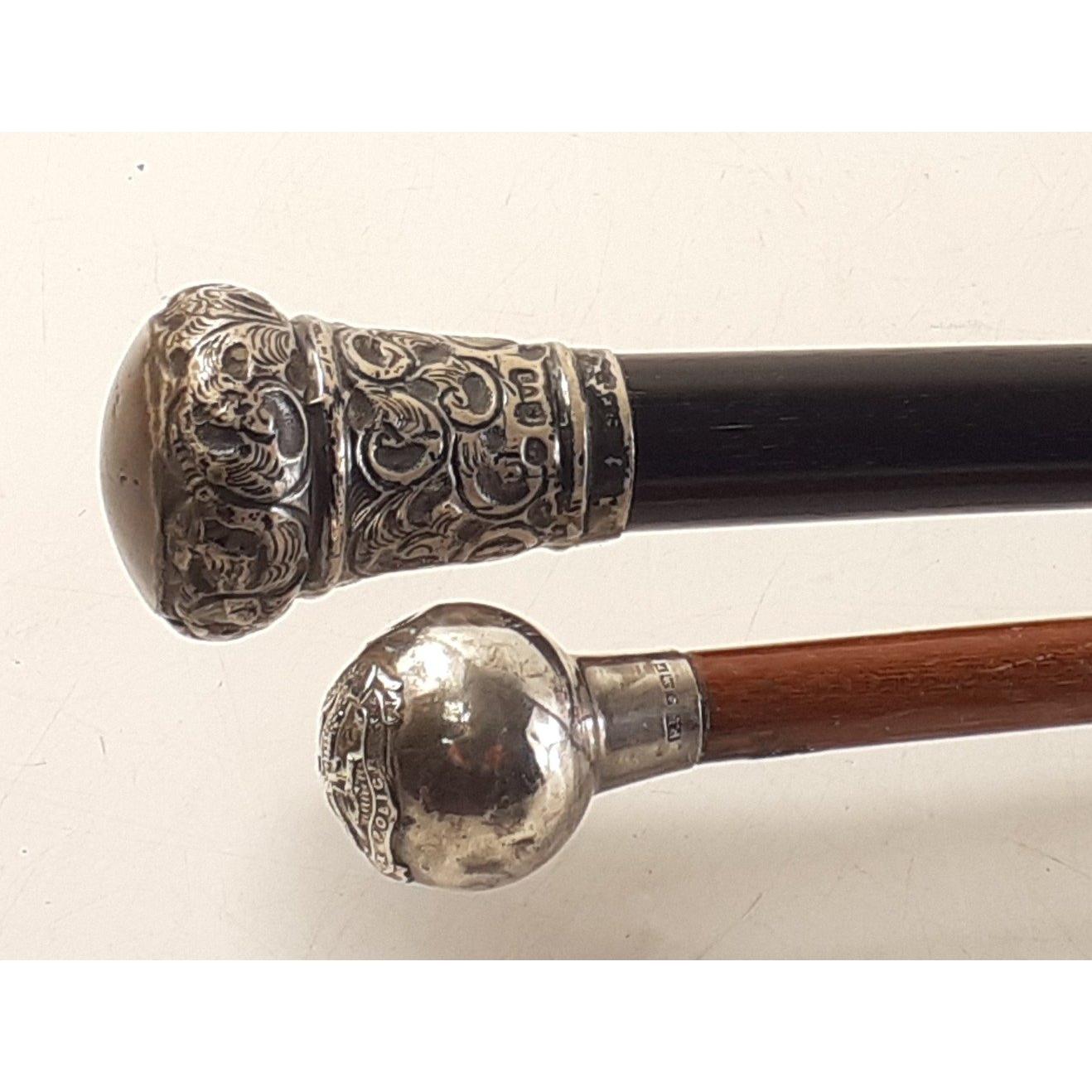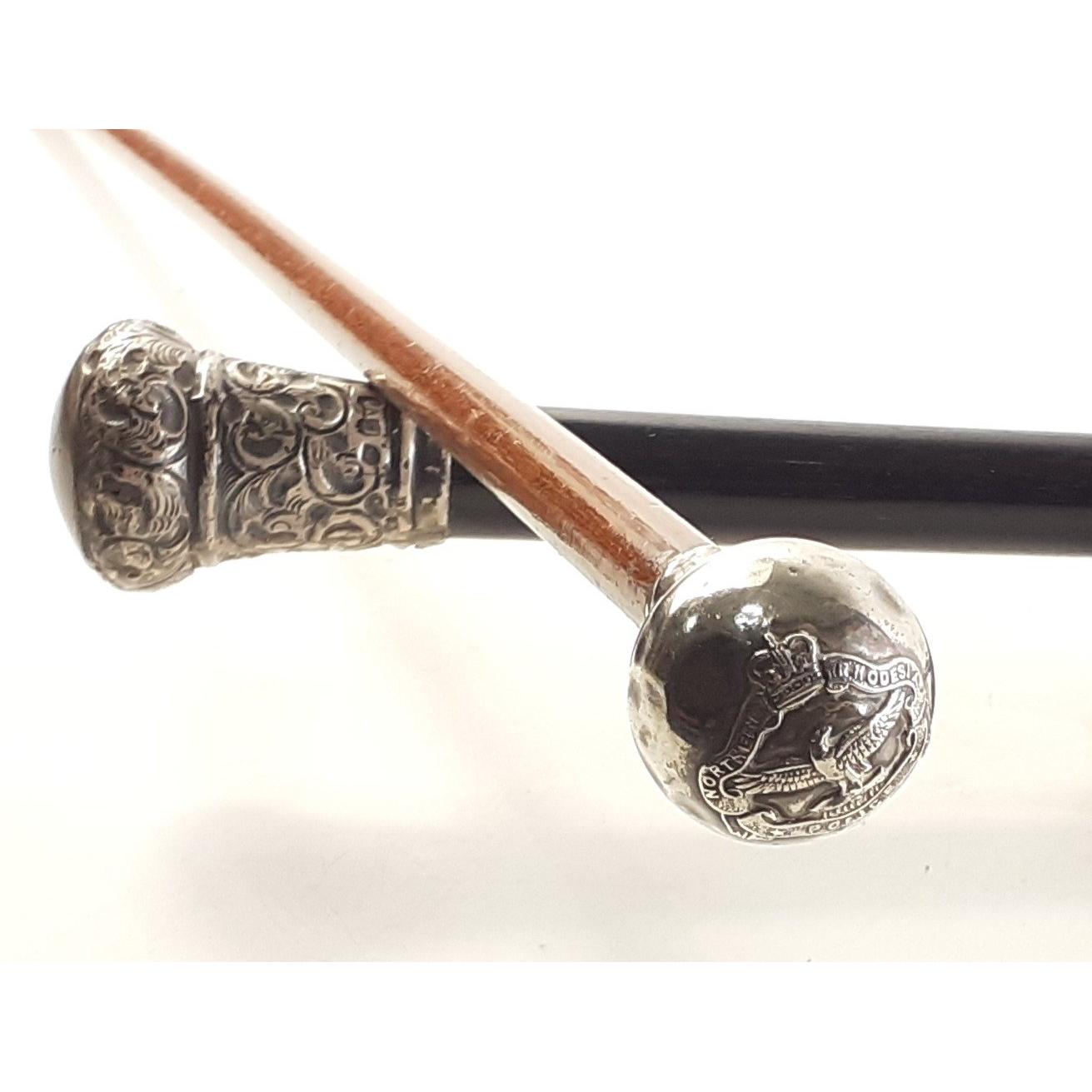 Silver topped 90cm walking cane London 1898 and a North Rhodesia silver topped swagger stick with 1950s hallmark.