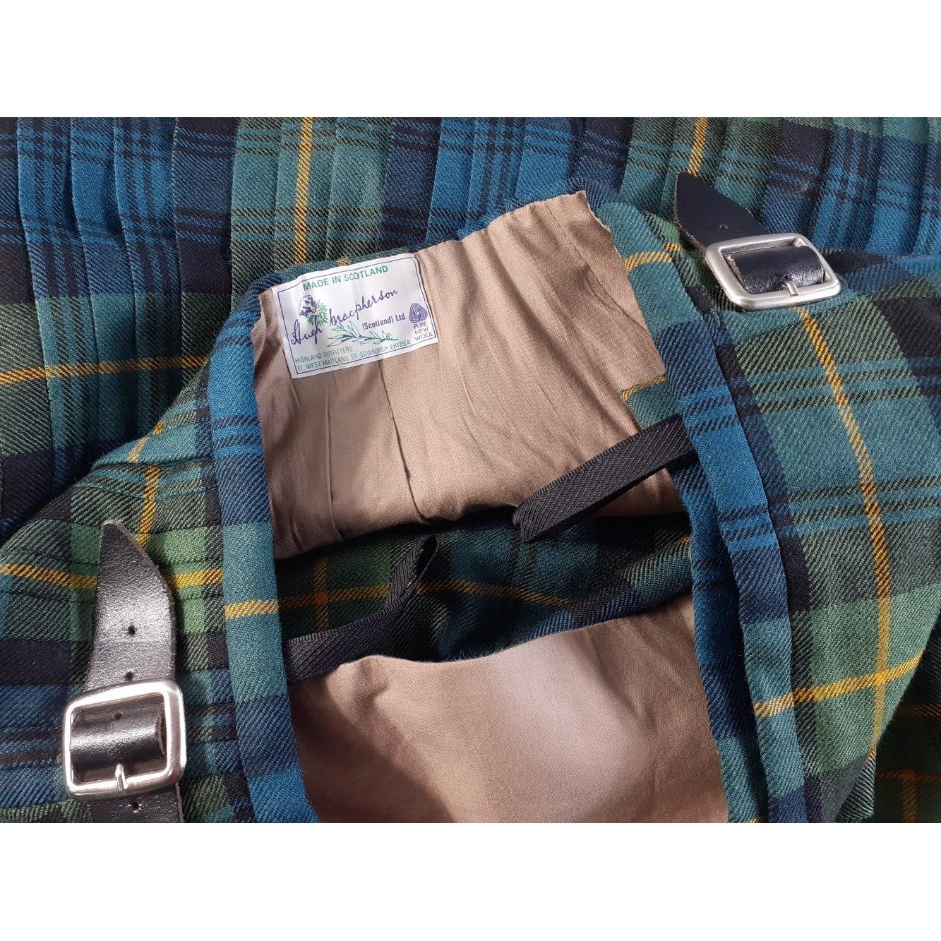A gent's 100% pure new wool kilt in the Gordon tartan, waist approx 32in, made by HUGH MacPHERSON of Edinburgh, plus a pair of brogues size 10½ slightly worn, a brown leather day sporran, and a pair of flashes,