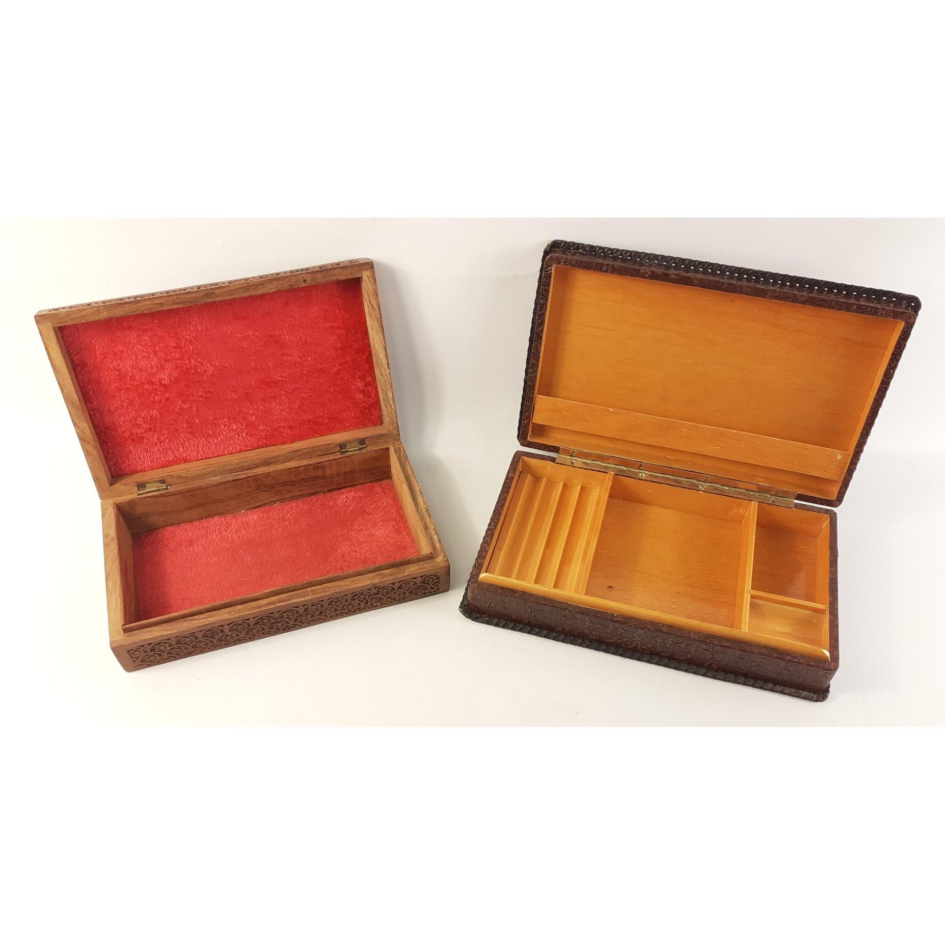 Two hand carved lidded boxes - ideal for storing jewellery and small collectibles - 11" x 7" x depth 2" approx