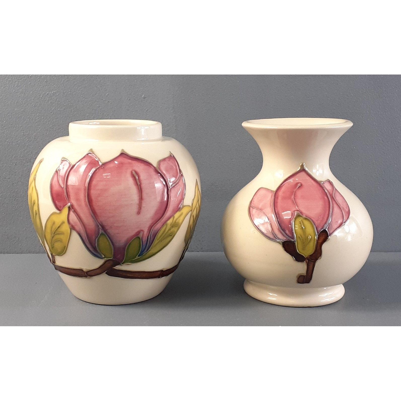 Two small MOORCROFT posy vases with pink peony design, signed with candle monogram. Each stands 10 cm tall approx with no damage.Approx 2 pieces