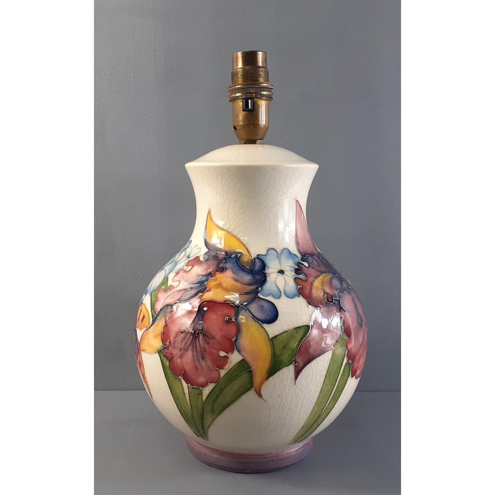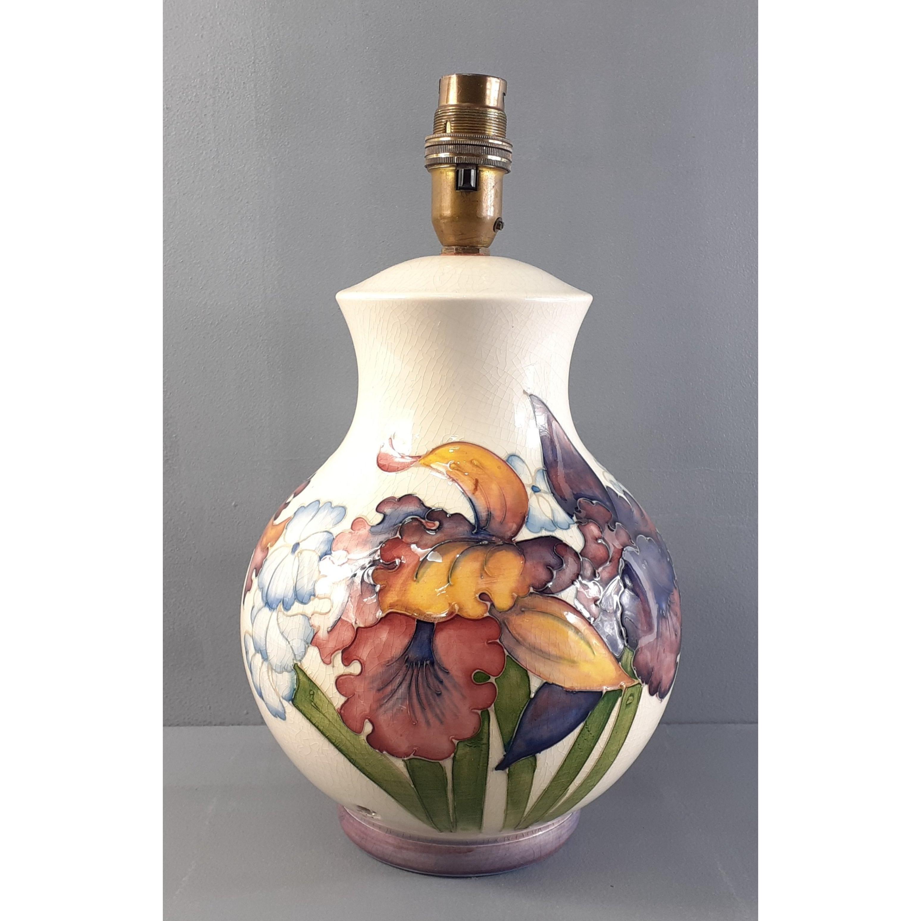 An attractive MOORCROFT electric table lamp with crackle glaze and lily design. Stands 21cm high. Needs re-wiring. No damage.Approx 1 pieces