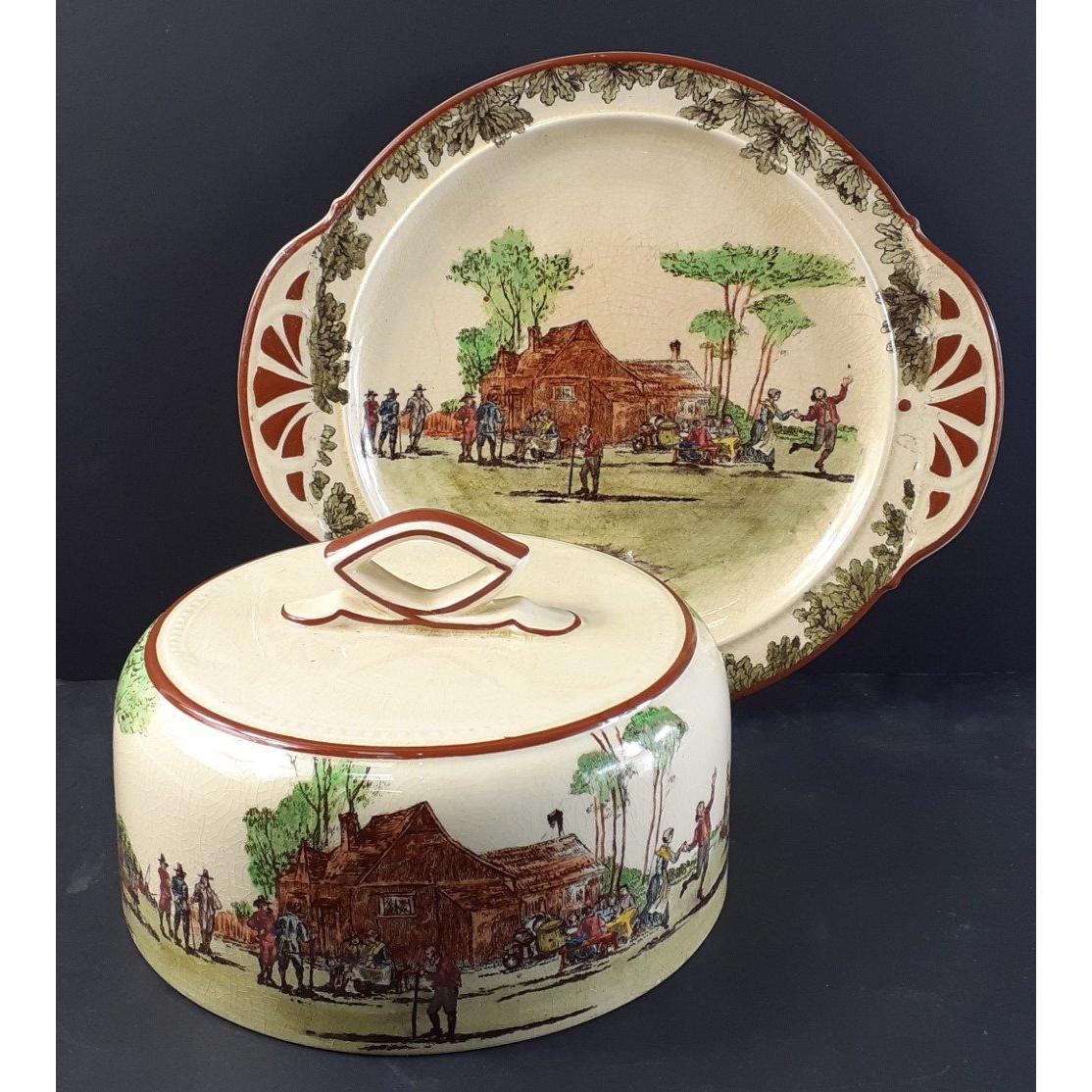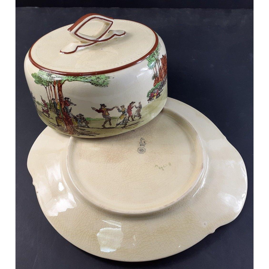An antique ROYAL DOULTON cheese / butter lidded dish with elaborate village scene decoration. Age related crackle to glaze as normal but no damage.
