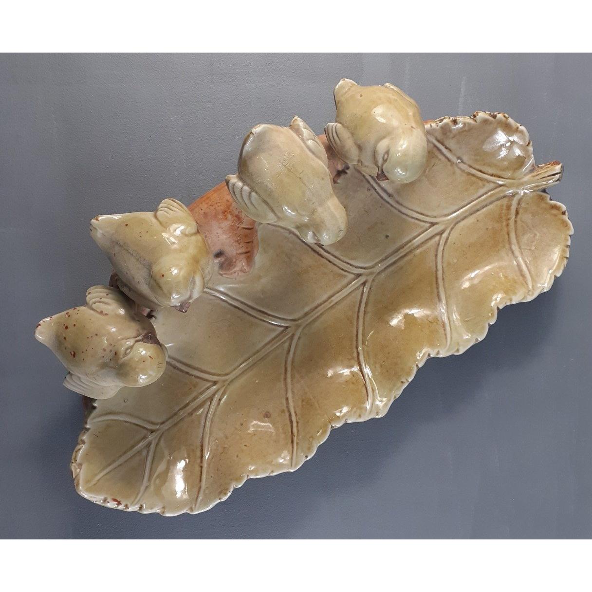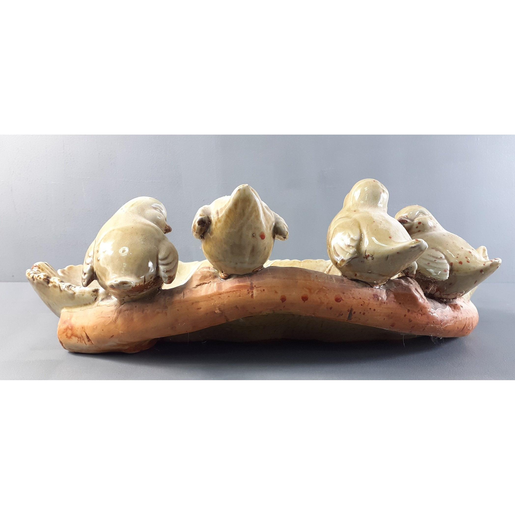 A cute pottery dish with 4 wee birds perched along the edge. Measures 39cm approx. No damage noted.Approx 1 pieces