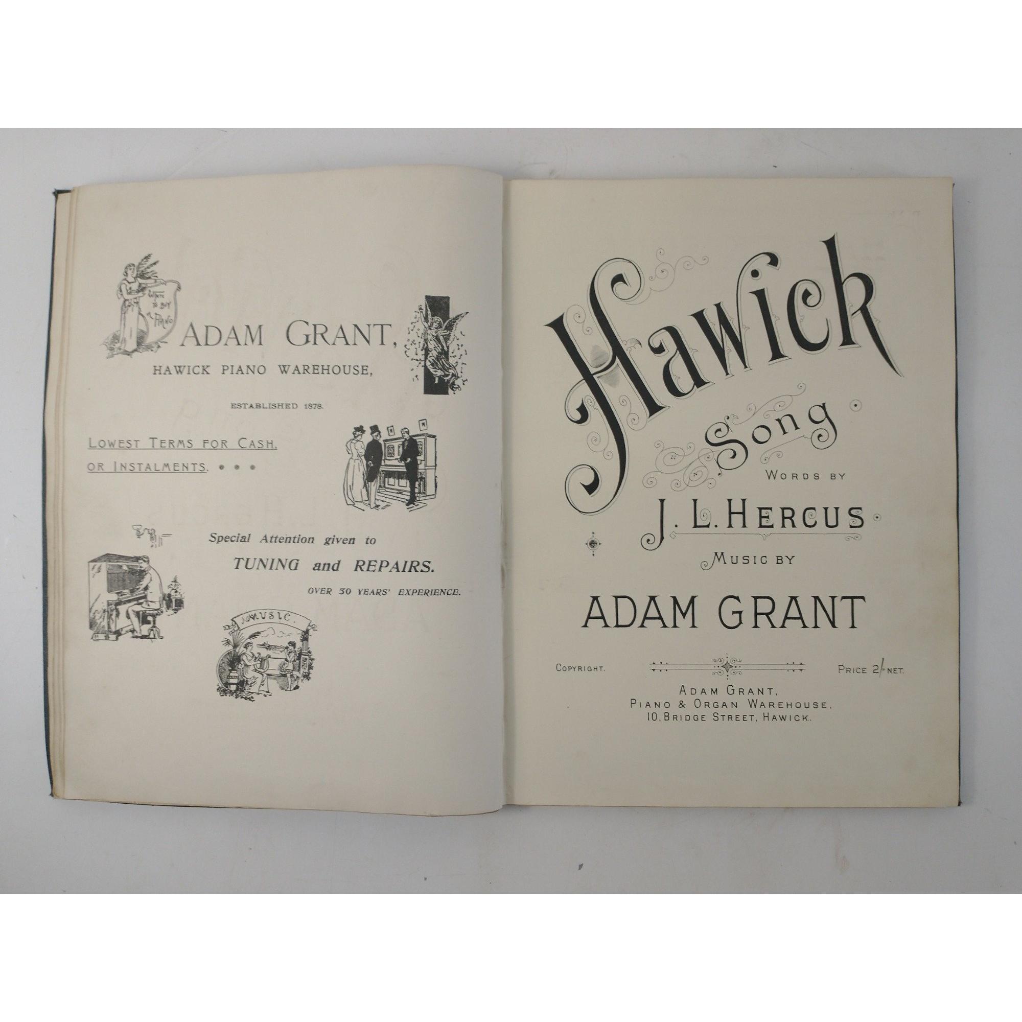 Local interest - HAWICK SONGS a collection of Hawick town songs including OOR AIN AULD TOON by Thomas Caldwell, I LIKE AULD HAWICK THE BEST by Tom Ker, CLINTY'S SONG from the Gutterbludes by JED Murray amongst many others. Published by ADAM GRANT of Hawick Piano & Music Warehouse in late 1800s