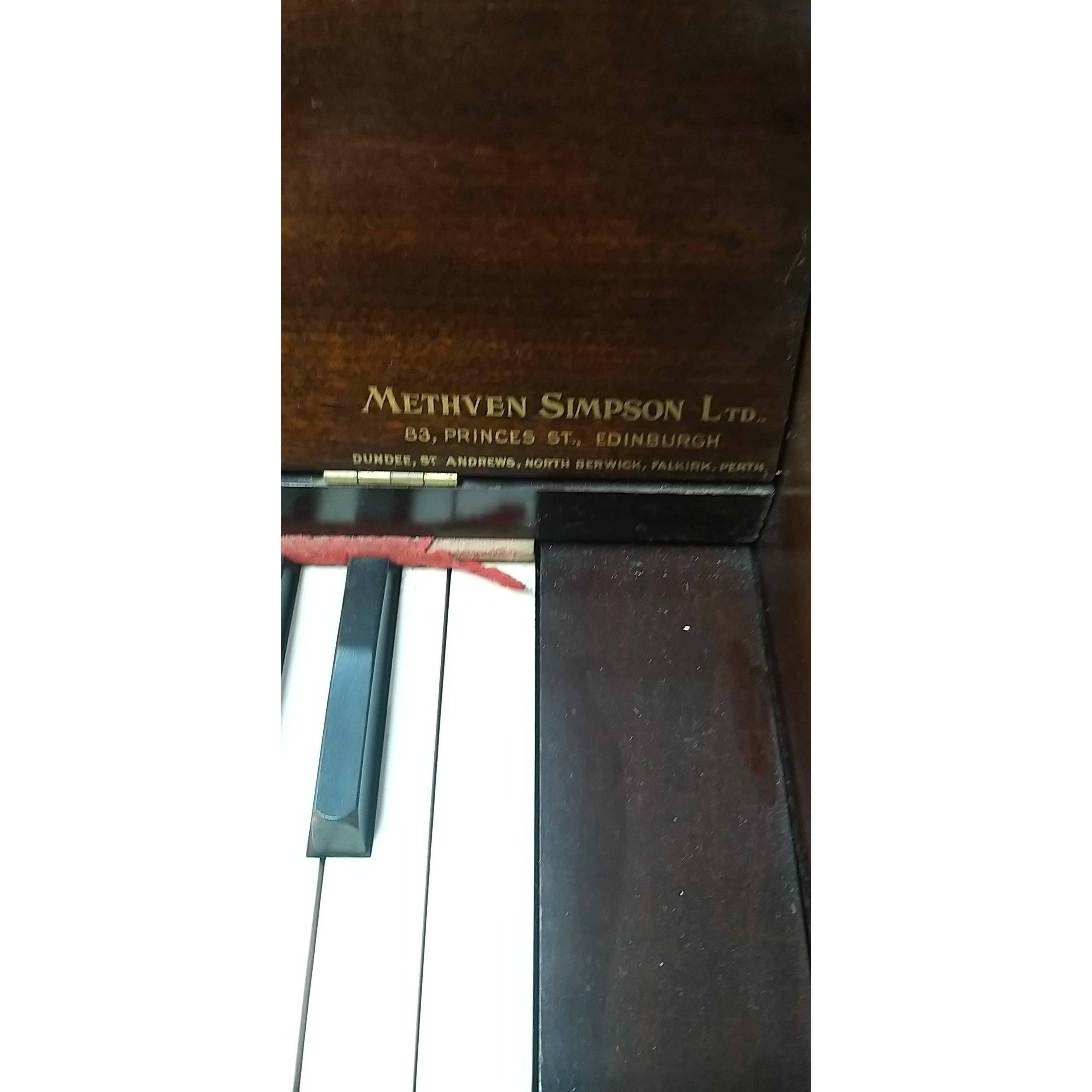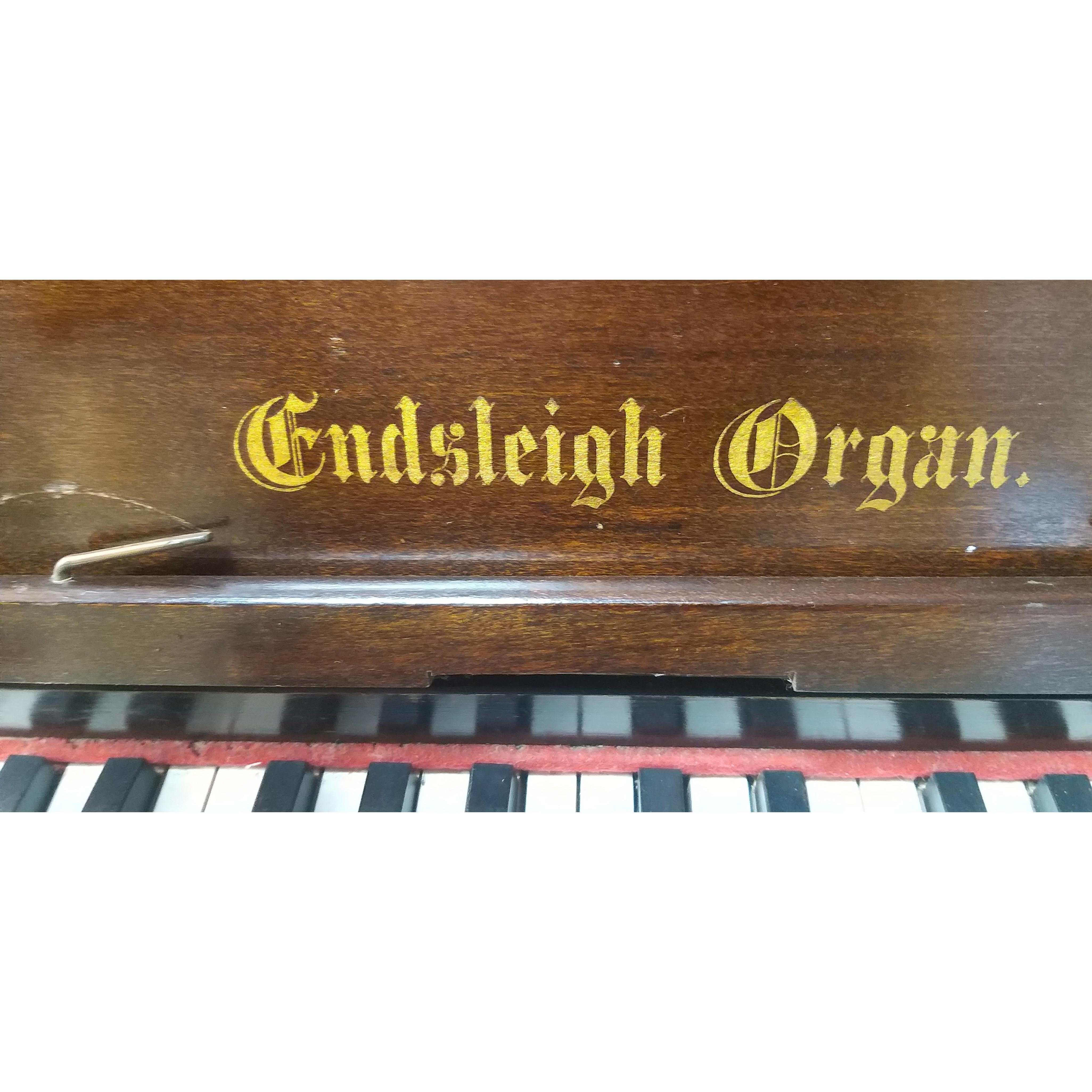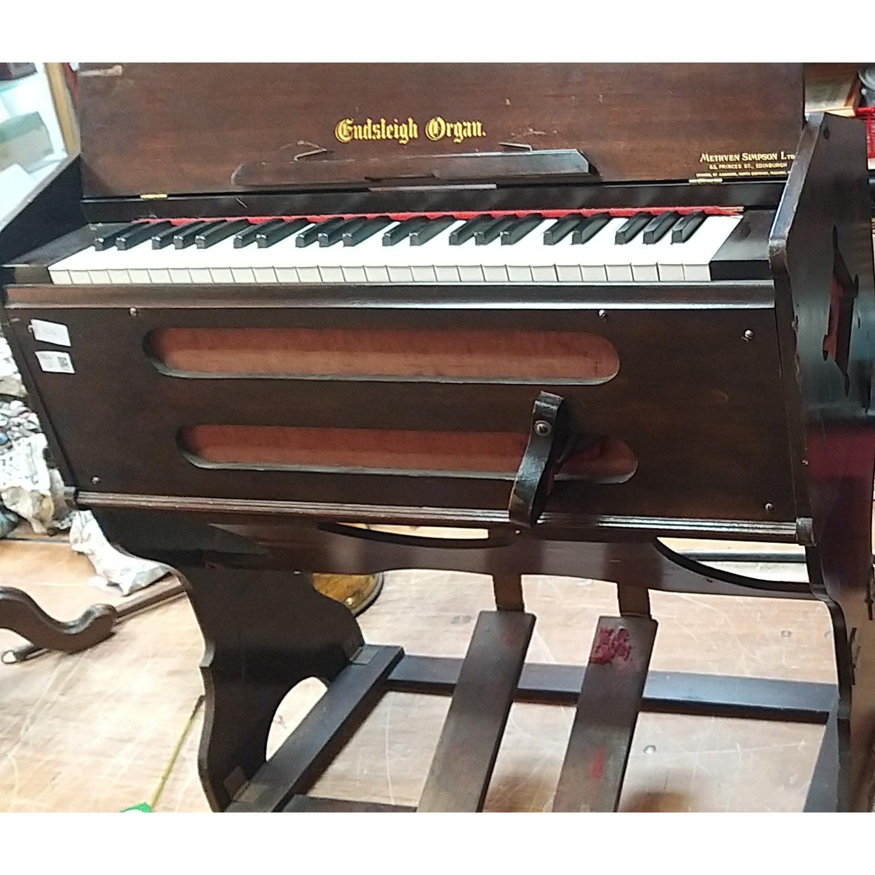 ENDSLEIGH ORGAN. Vintage table top organ. Retailed by METHVEN SIMPSON Ltd, of Princes Street Edinburgh. Measures 82cm x 40cm x 40cm approx. With wear but appears generally intact. With fold out stand. Bellows appear to be OK as works when pedals pumped.