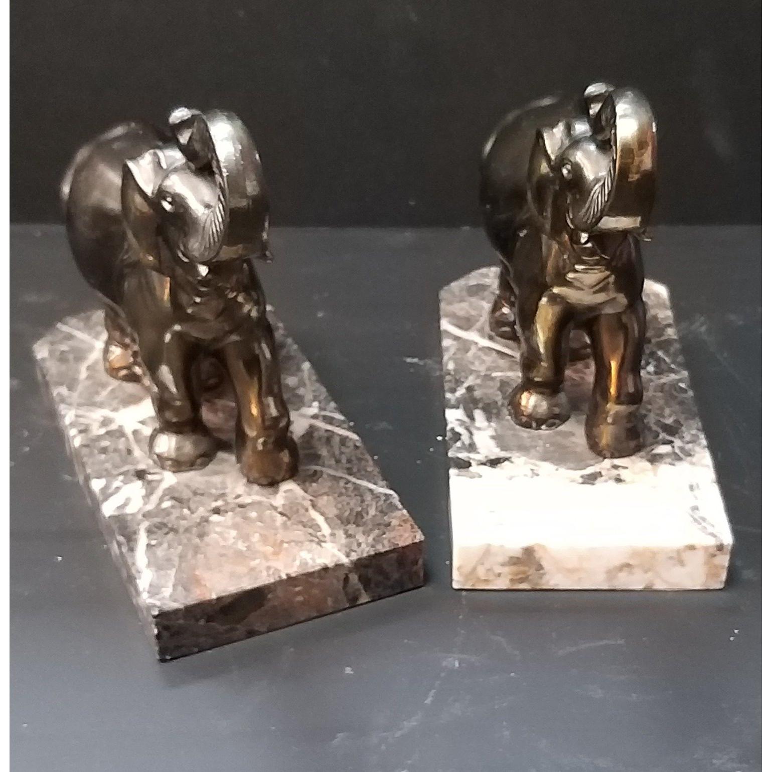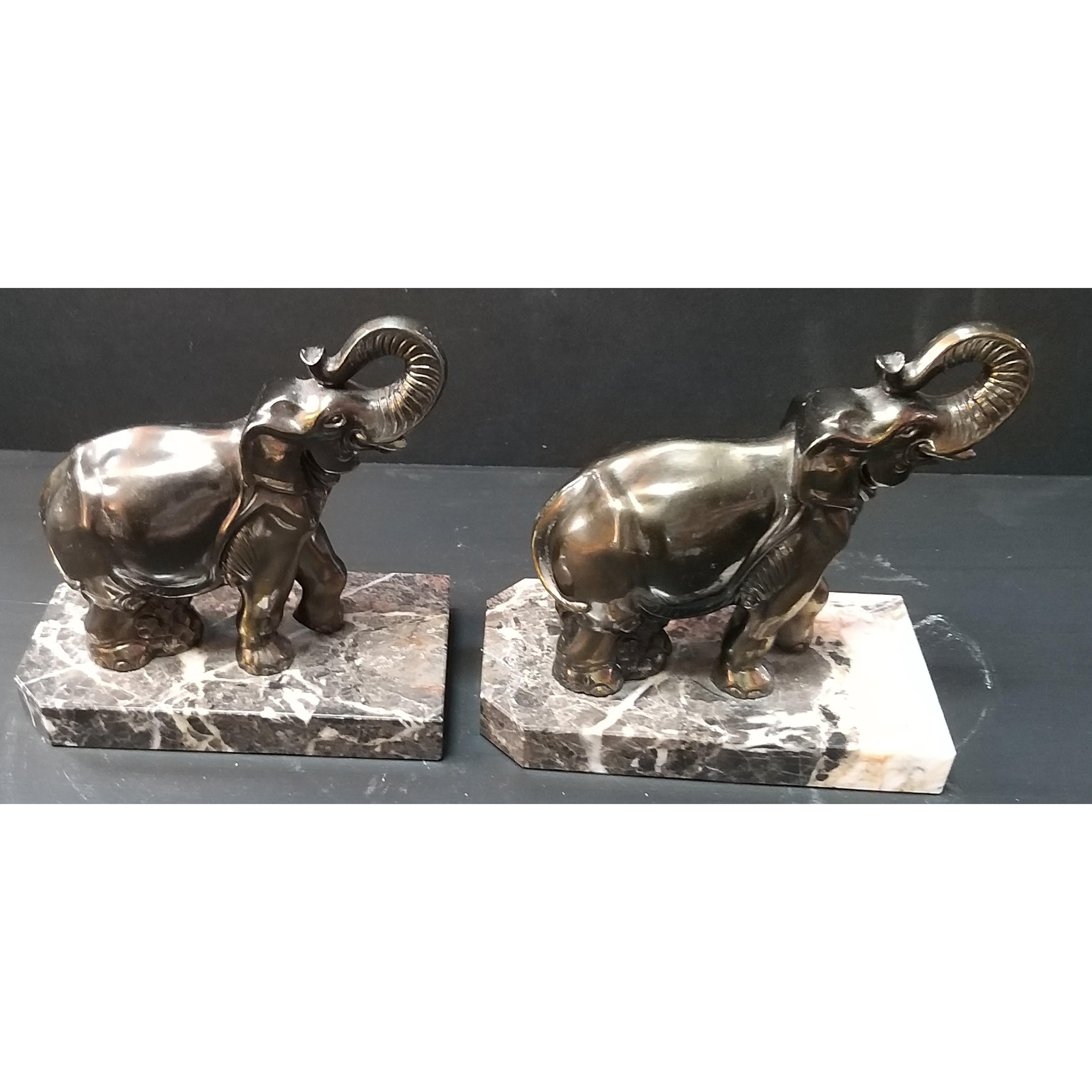 A pair of cute BRONZE EFFECT elephant book ends on different marble pattern bases - dimensions height 15cm x width 14cm approx Approx 2 pieces