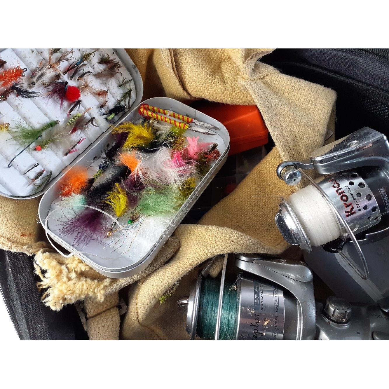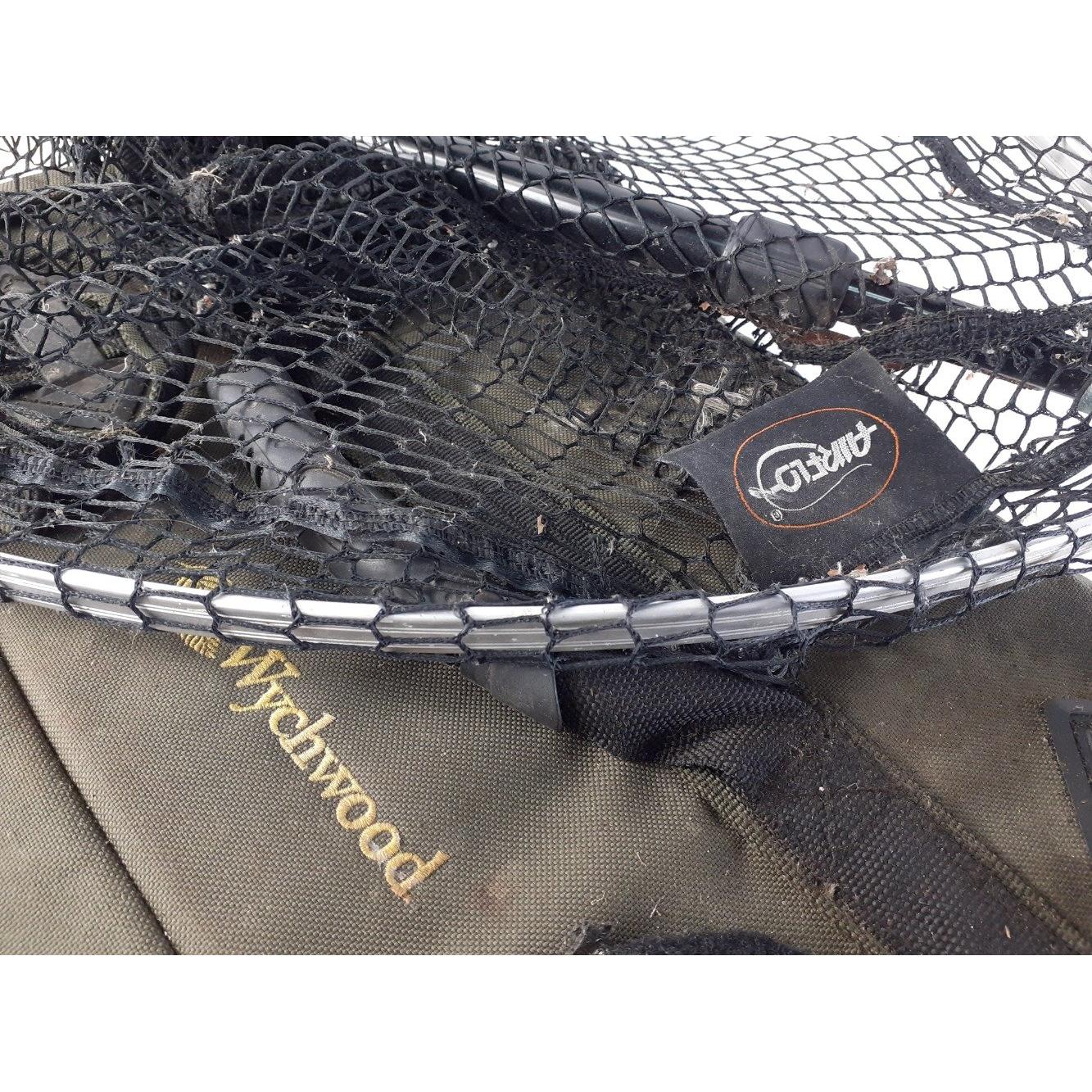 WYCHWOOD fishing tackle bag with contents to include OKUMA interceptor spinning reel, KRONOS XL30 reel SHAKESPEARE reel, landing net and other fishing accessories.