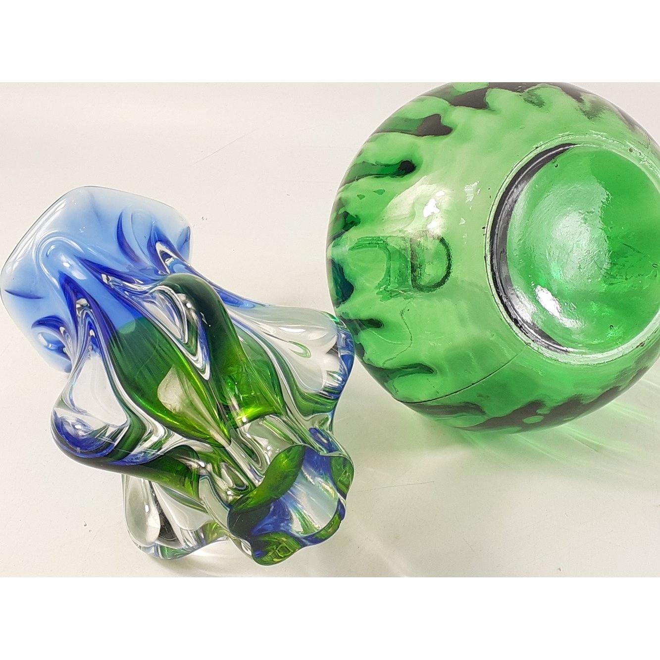 A green pressed glass pumpkin style bottle standing 12cm approx plus a European green and blue vase (22cm approx)Approx 2 pieces