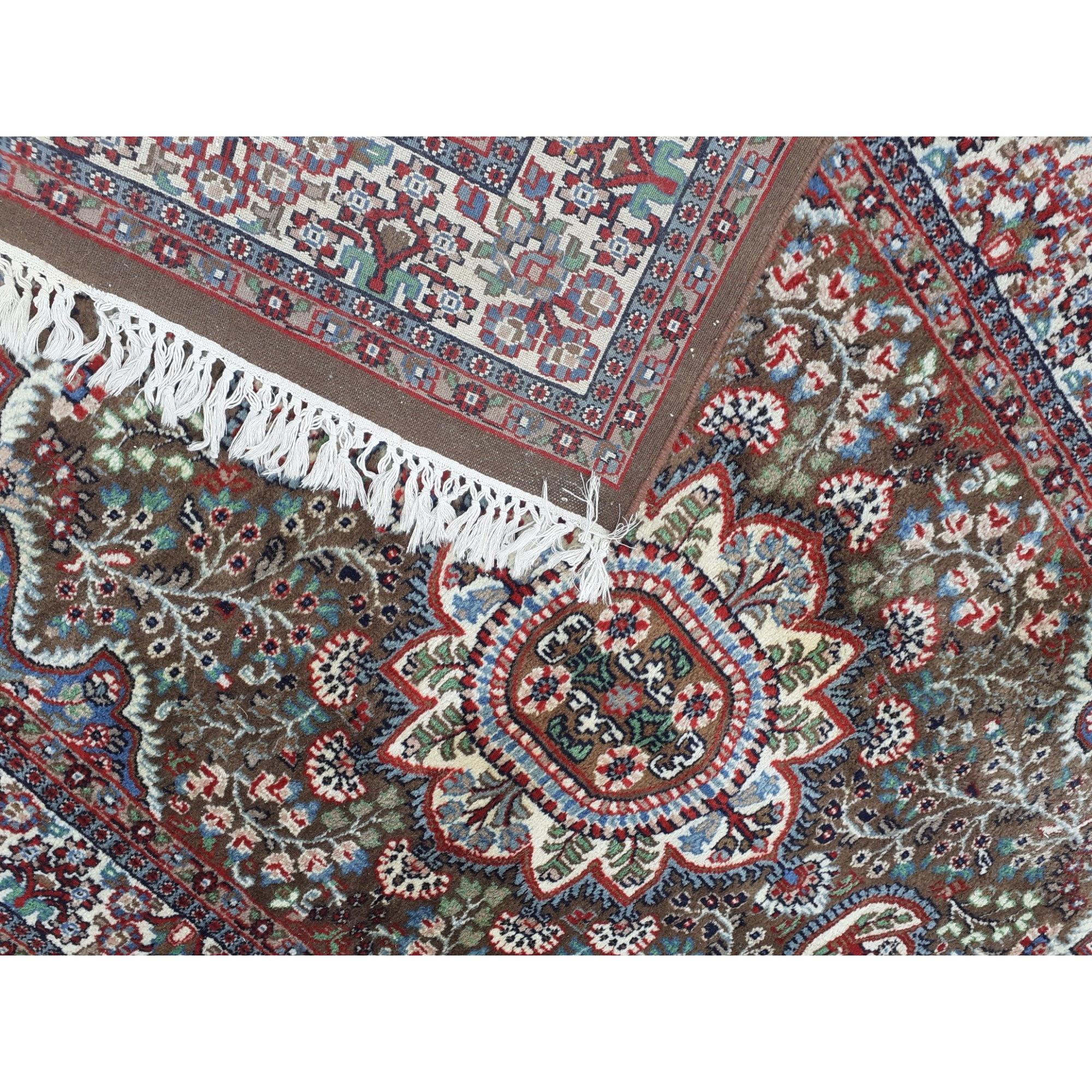 A wool rug in shades of red, cream and blue with a brown edging measuring L186 x W123cm approx