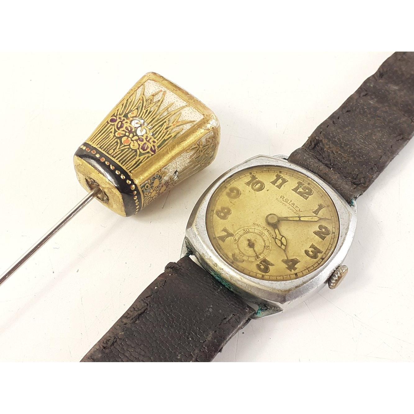 Small pretty Oriental style lidded box with pieces of black Victorian jewellery, glass perfume bottle, Rotary watch, not running, and brass topped hat pin.