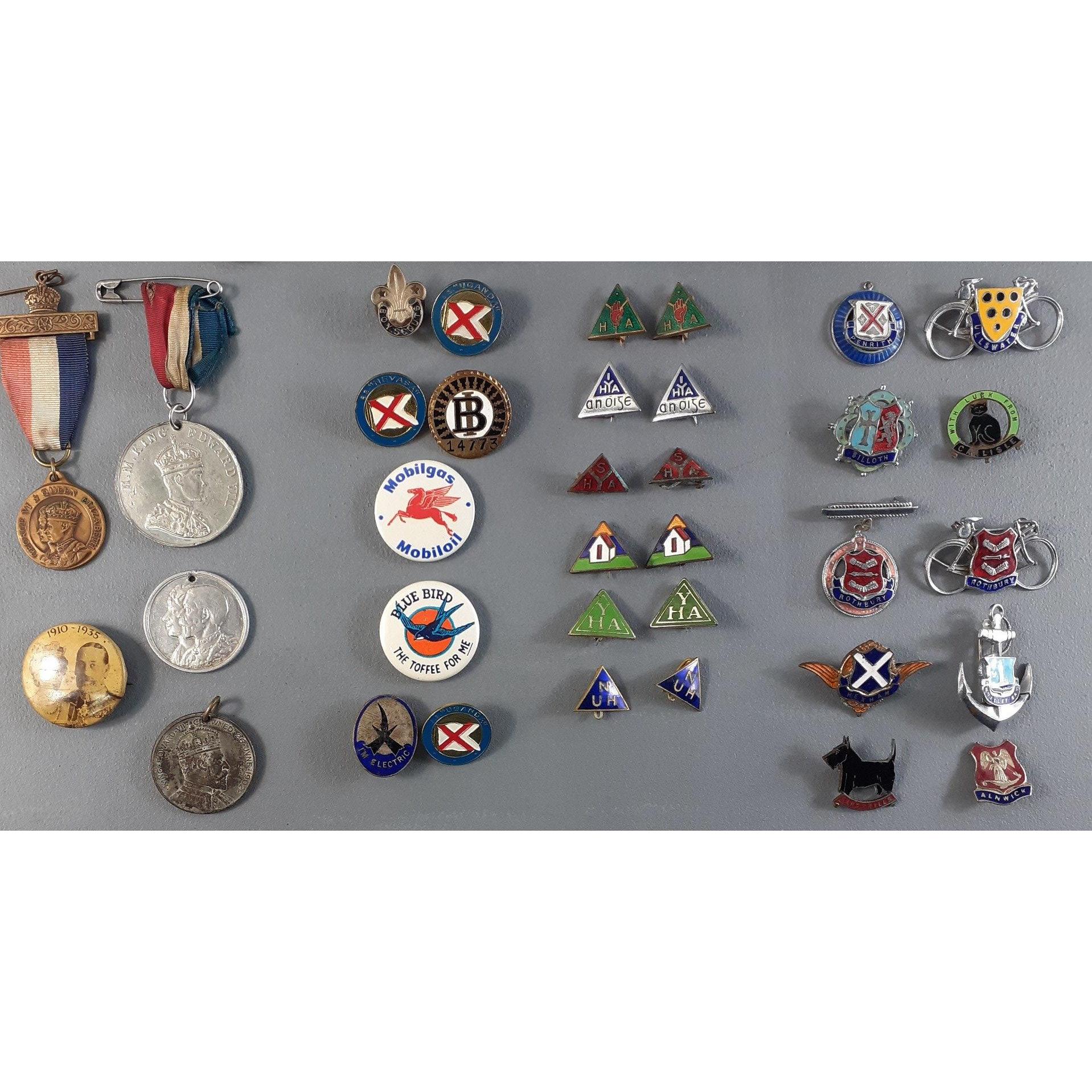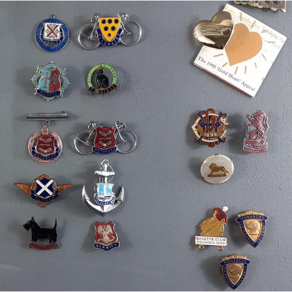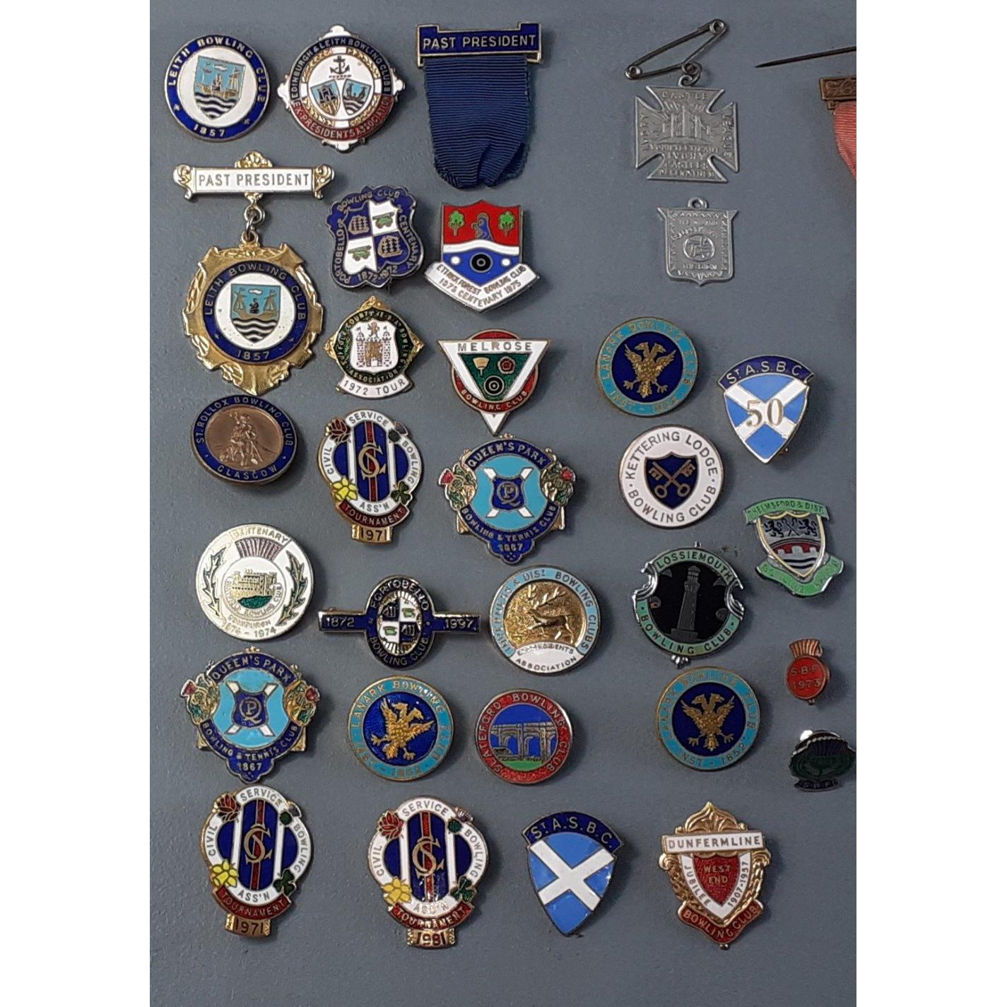 An EPNS nurse's belt plus a box of bowling club pins and also mixed collection of badges including Royal commemorative, speedway etcApprox 2 pieces