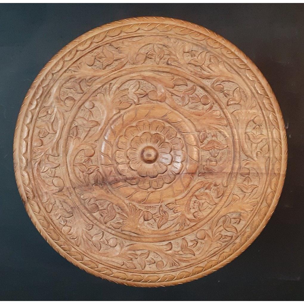 A carved wooden side table ( 45cm dia approx ) on an octagonal folding base 55cm high approxApprox 2 pieces