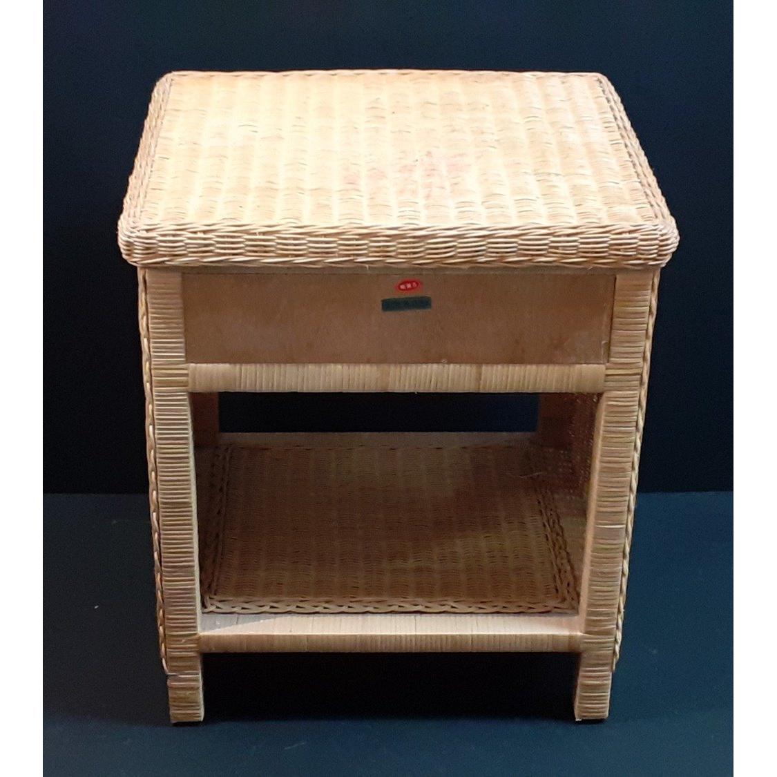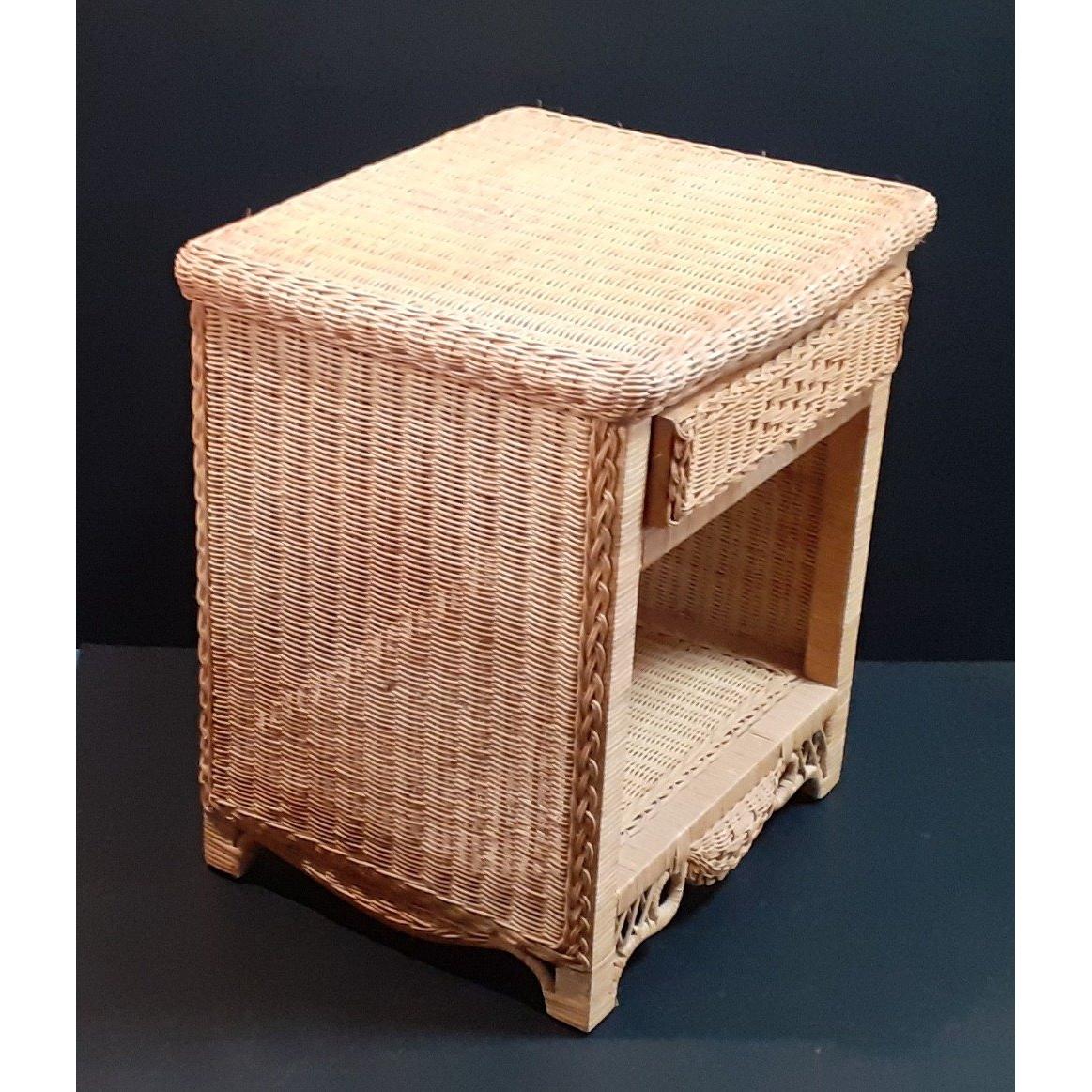 A wicker table with drawer measuring H65 x W55 x D46cm approx