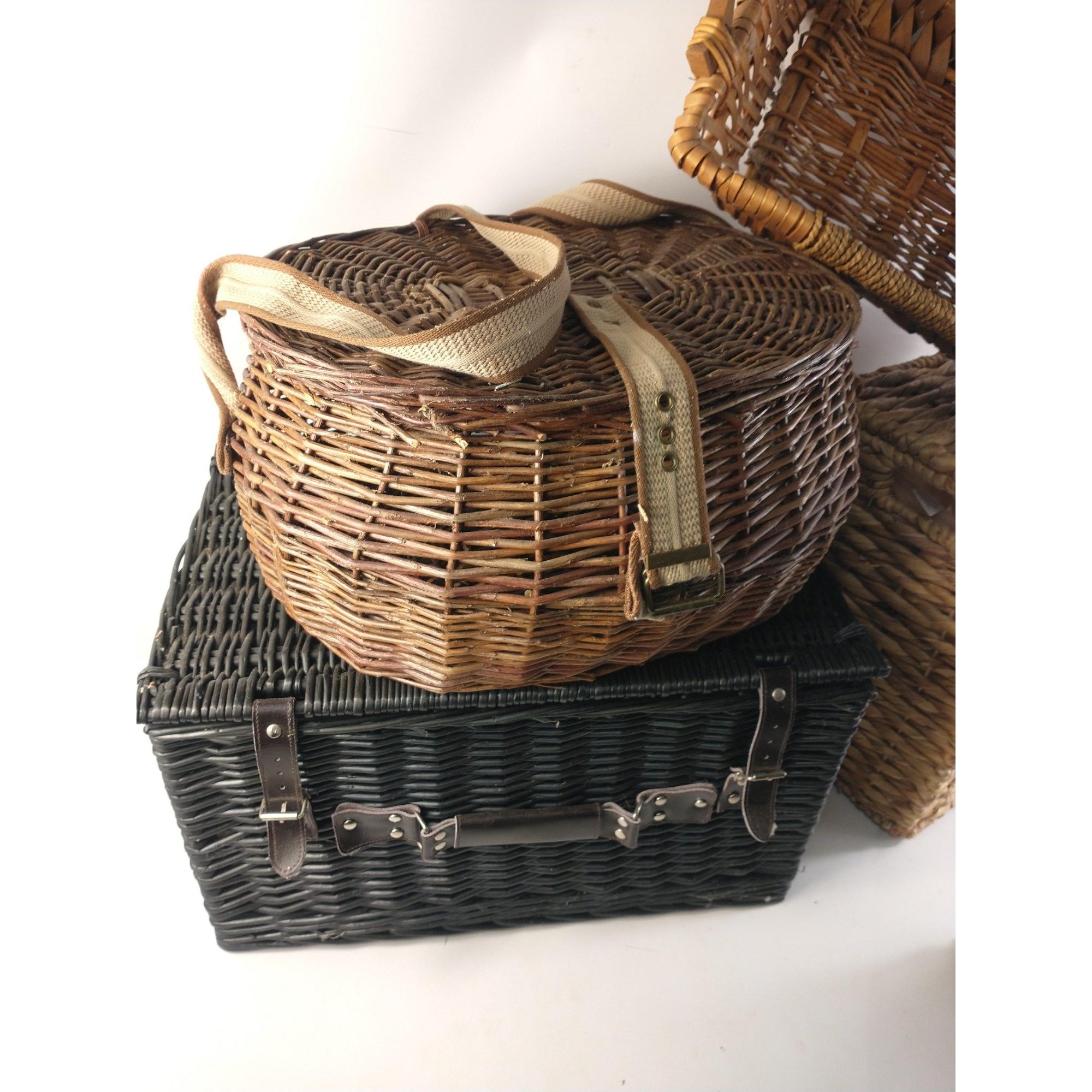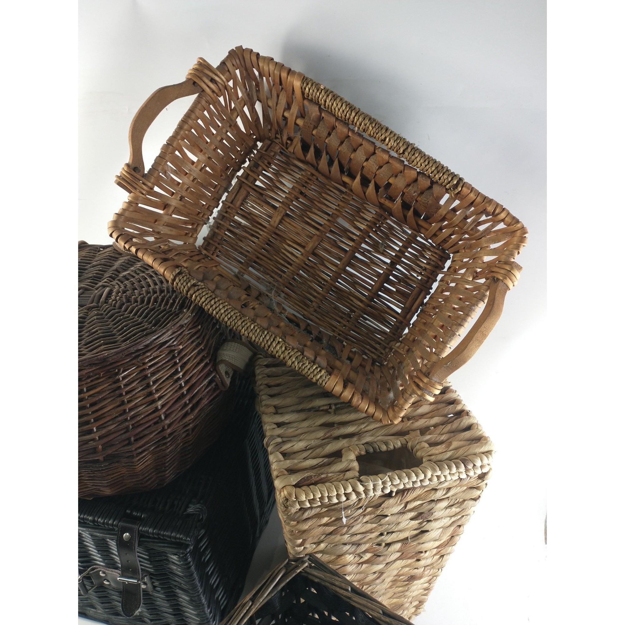 A handy wicker lot comprising a hamper, a creel style basket, a waste basket and 2 trays.Approx 5 pieces