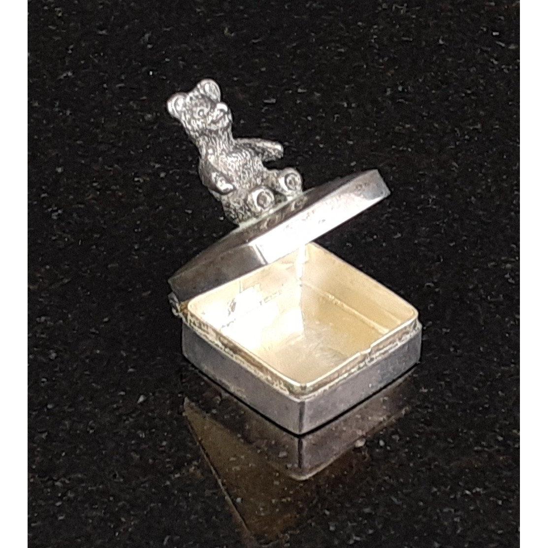A really rather lovely tiny silver box with a teddy bear on top - fine for keeping a child's first tooth, measures H25mm, x 20mm x 20mm. Weight: 8g approxApprox 1 pieces