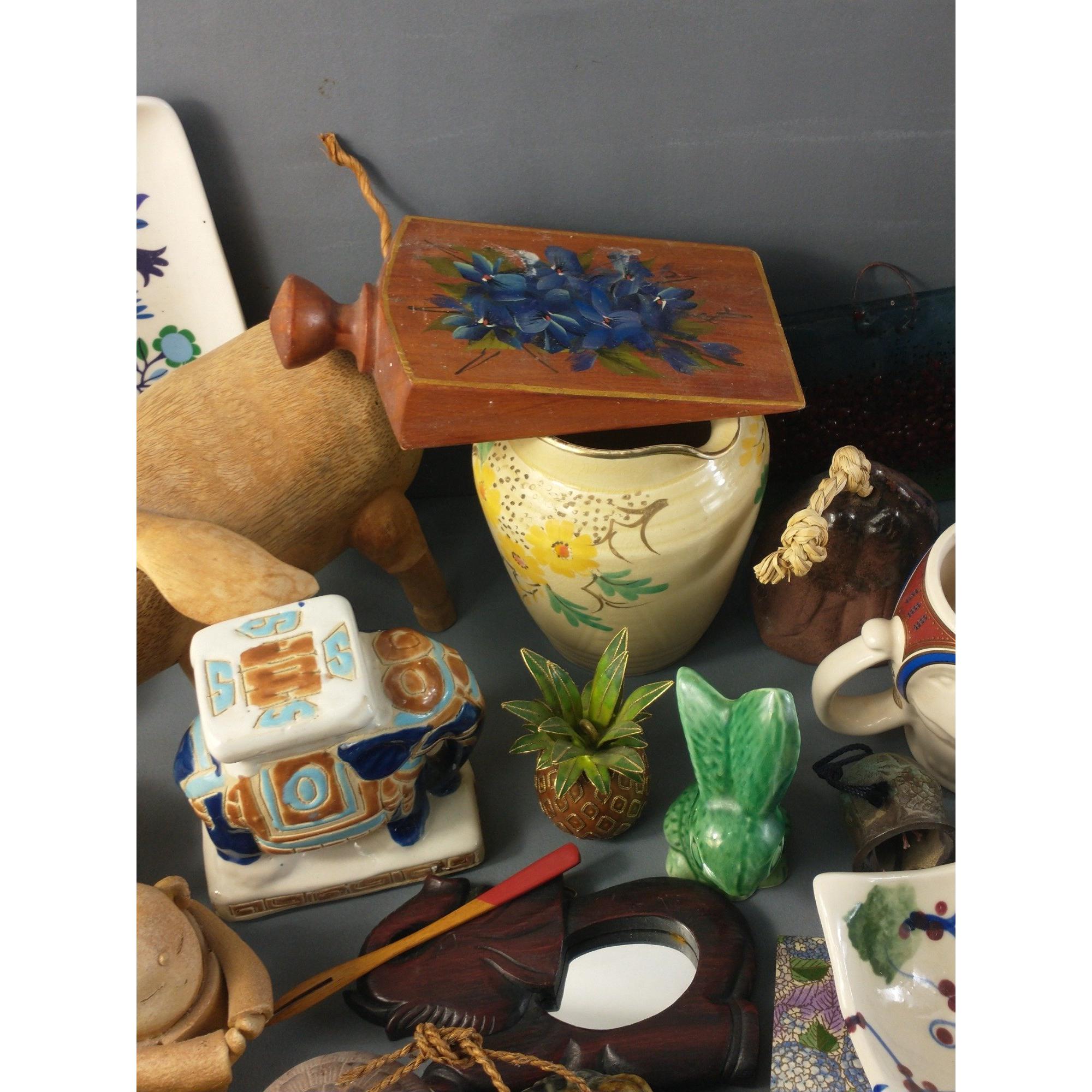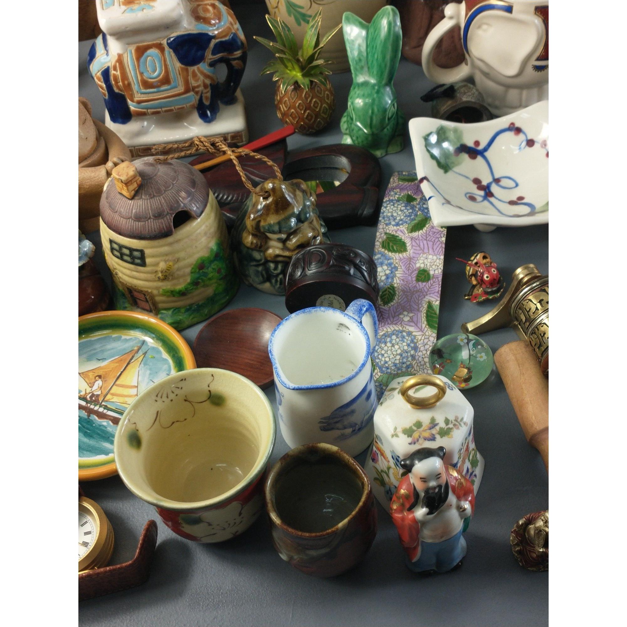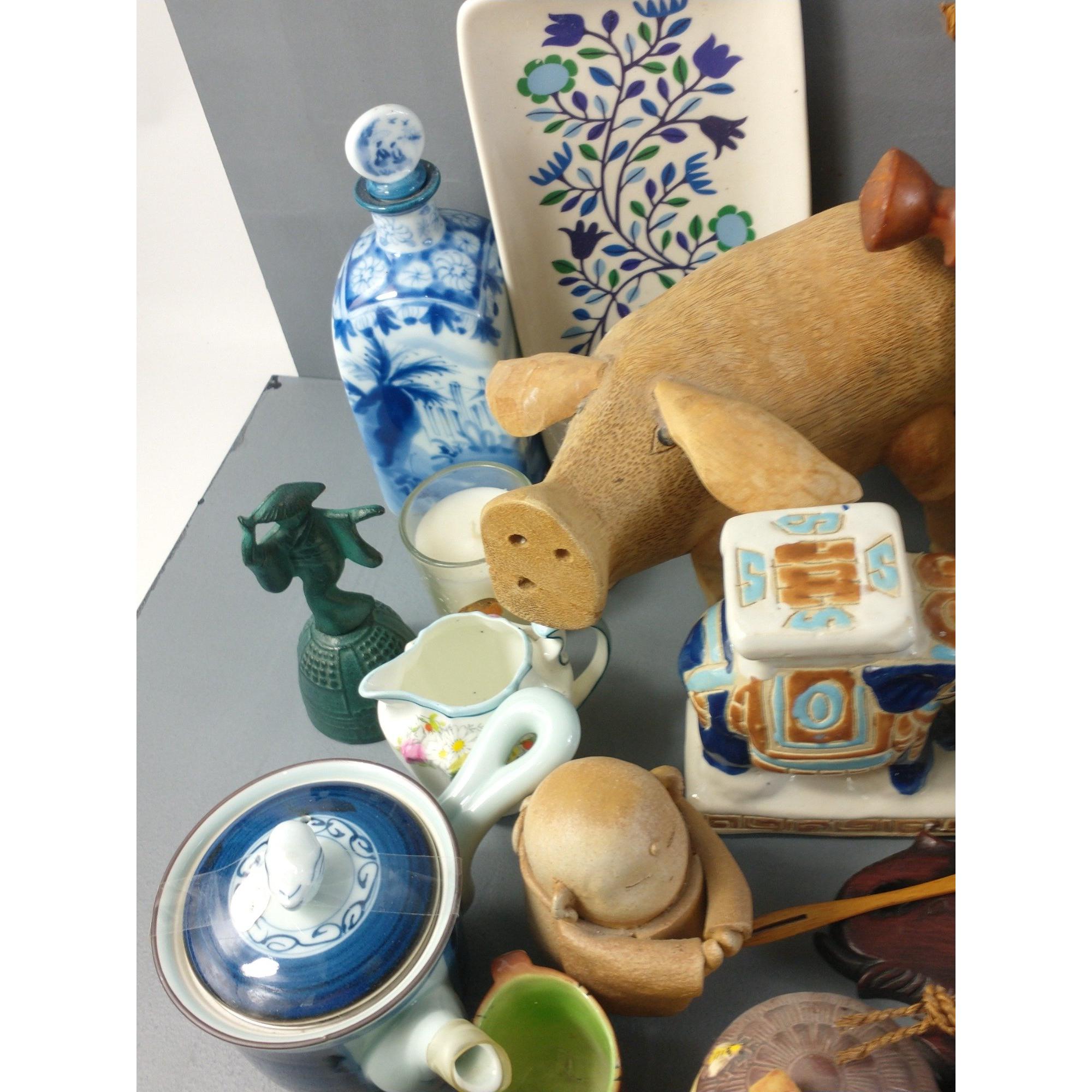 A box of decorative mainly ceramic items to include a CAMPSIE WARE rabbit, a wooden pig, Japanese honey pot, and many Oriental style items