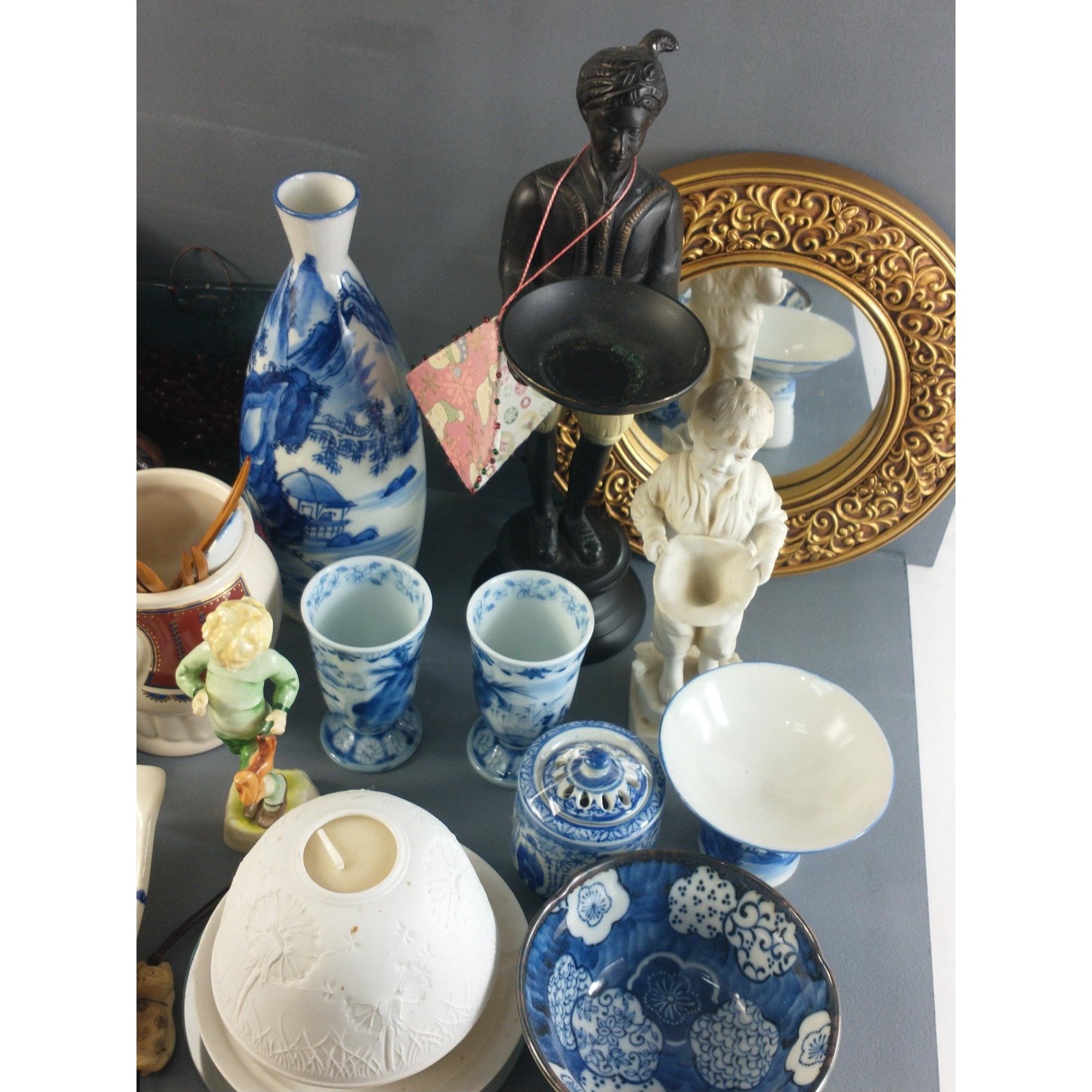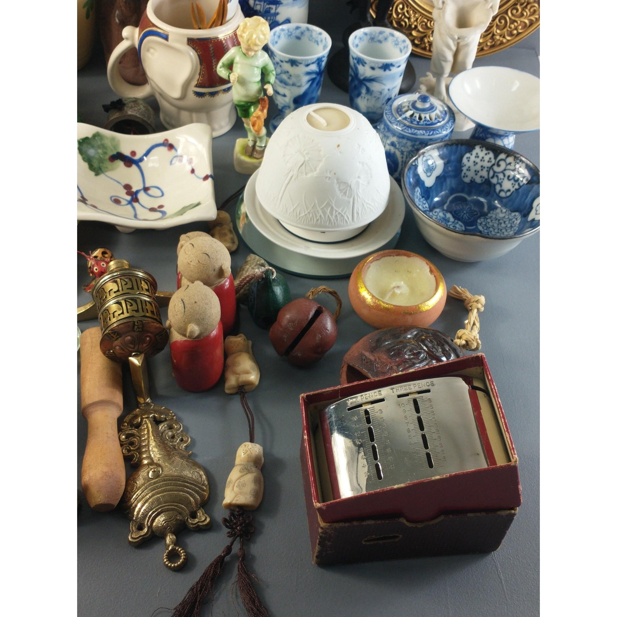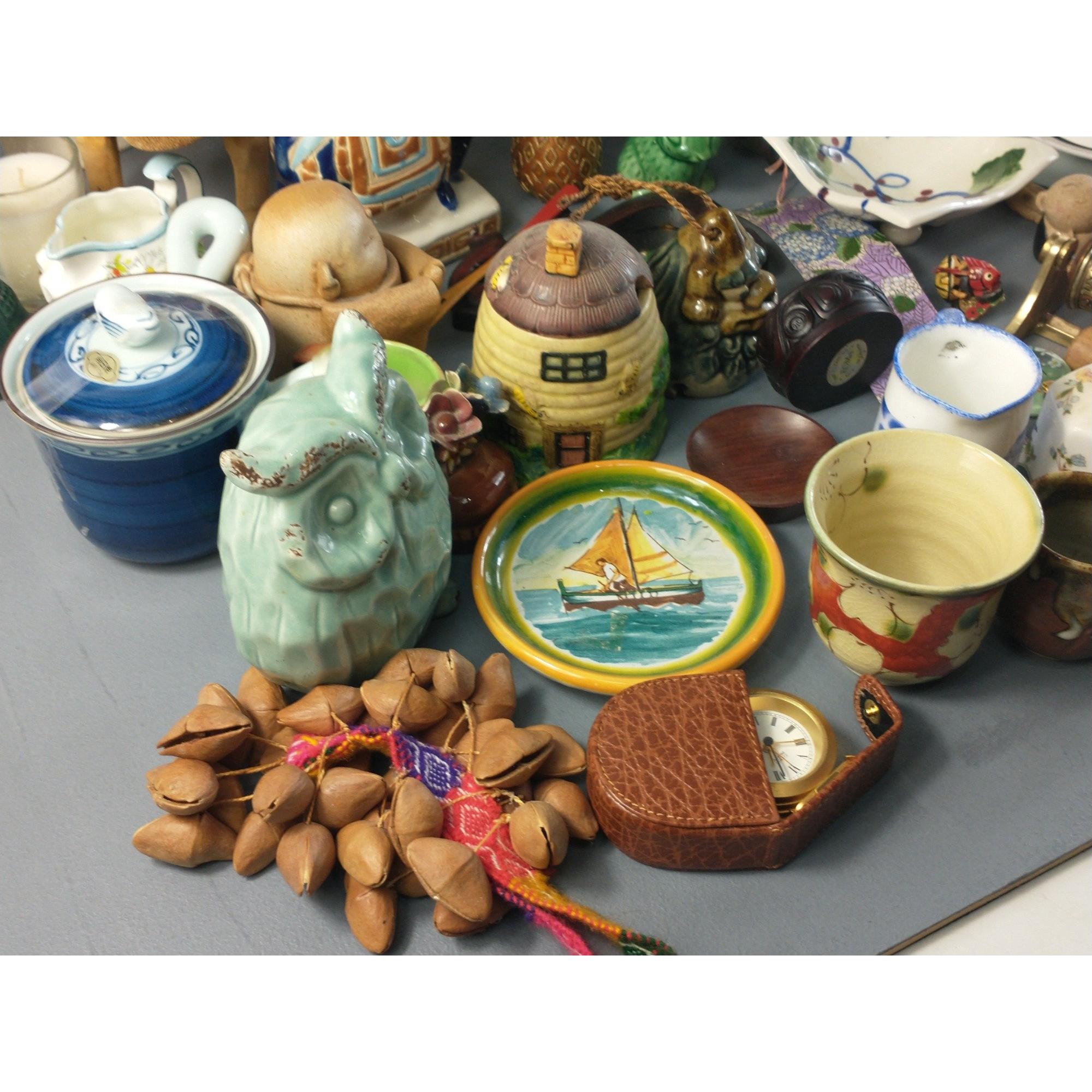 A box of decorative mainly ceramic items to include a CAMPSIE WARE rabbit, a wooden pig, Japanese honey pot, and many Oriental style items