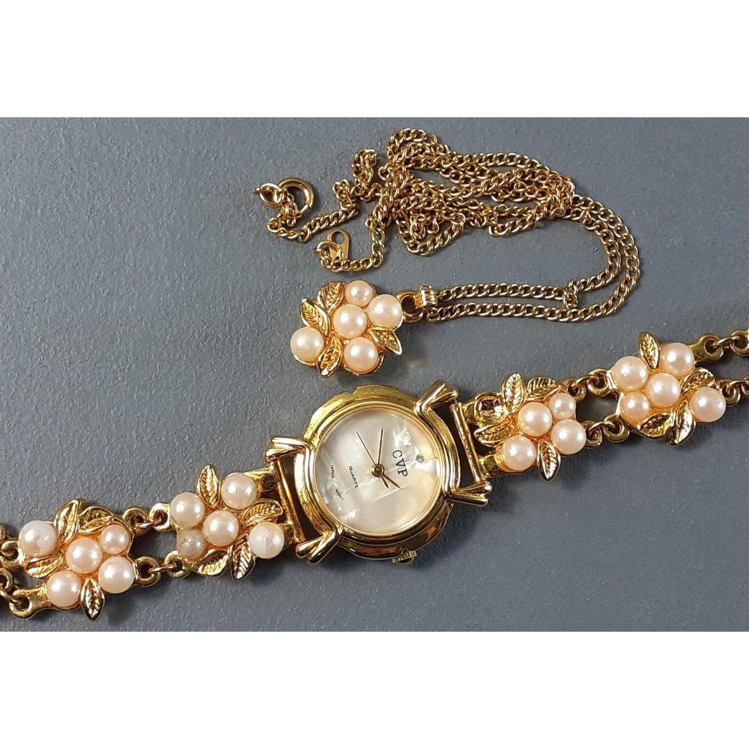 Dress ladies CVP Quartz watch with pretty gilt bracelet and pearls. Also a matching pendant on chain.
