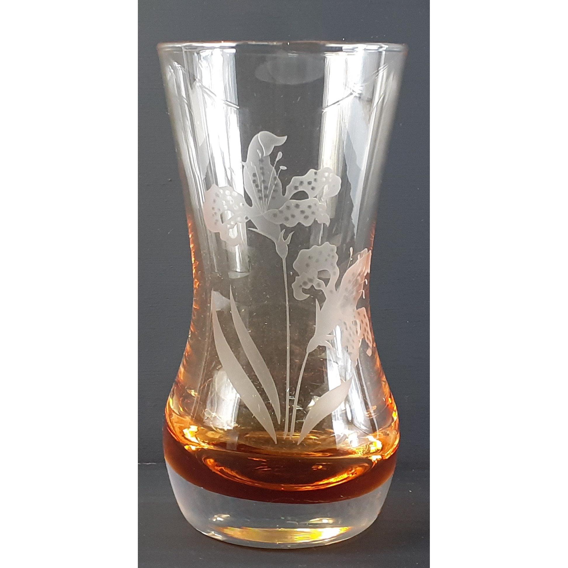 A boxed CAITHNESS smoky glass vase with etched lily design 18cm tall approx. No damage.Approx 1 pieces