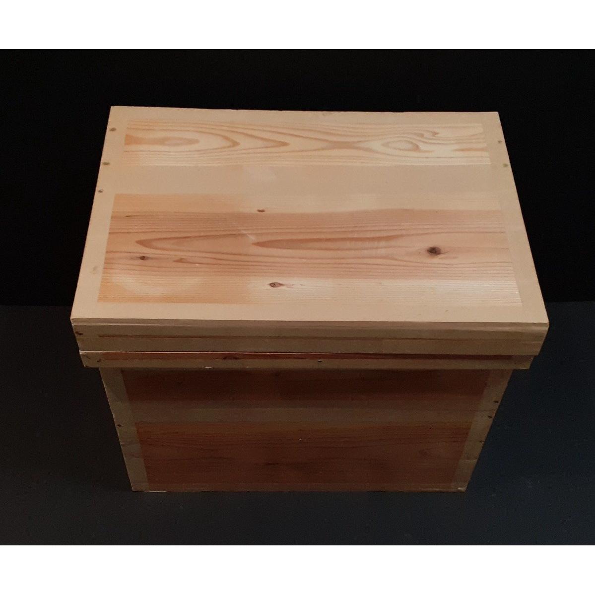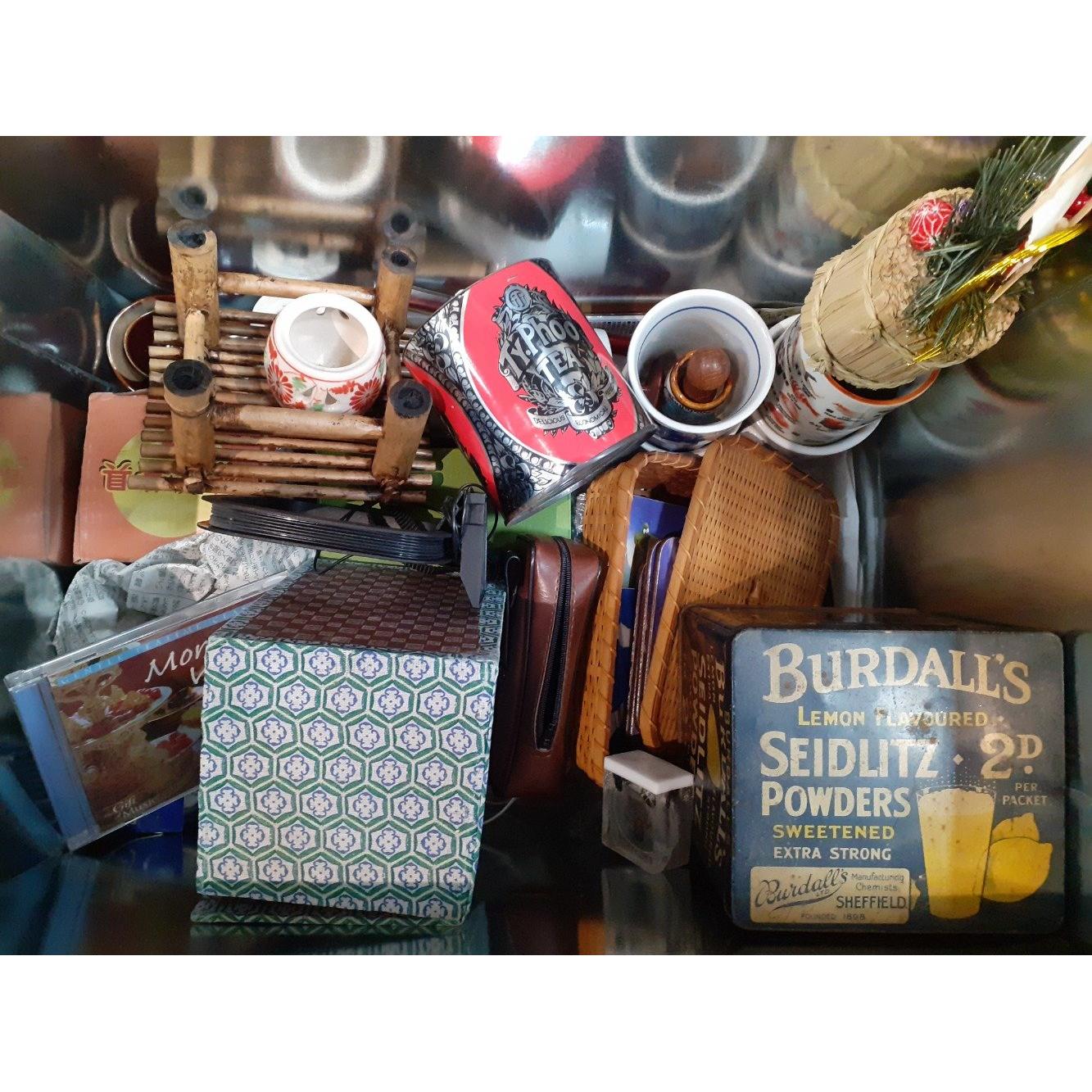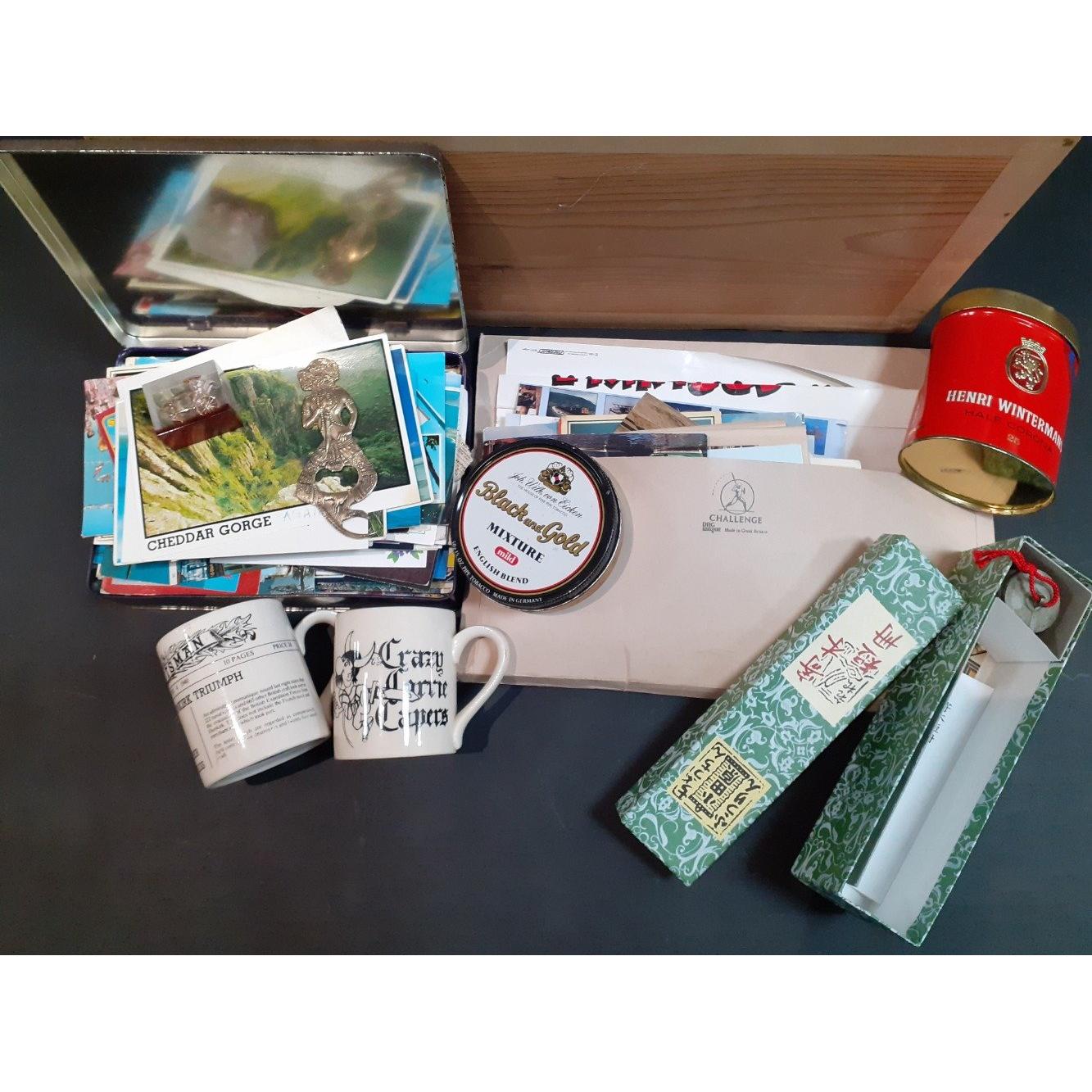 A wooden case with metal lining with contents to include old tins, beakers, mugs, souvenirs etc. Box measures 51x36x42cm approx