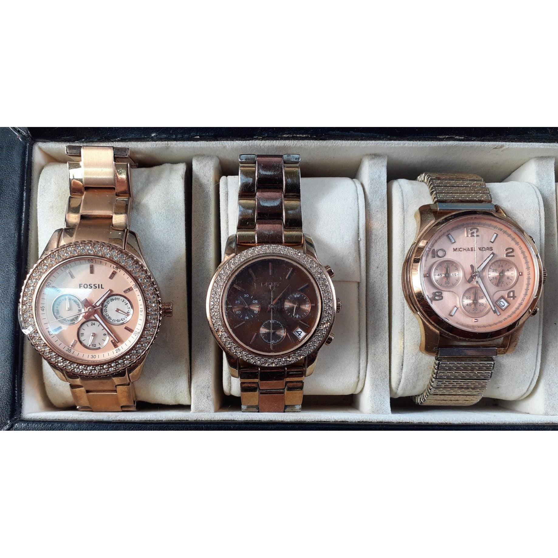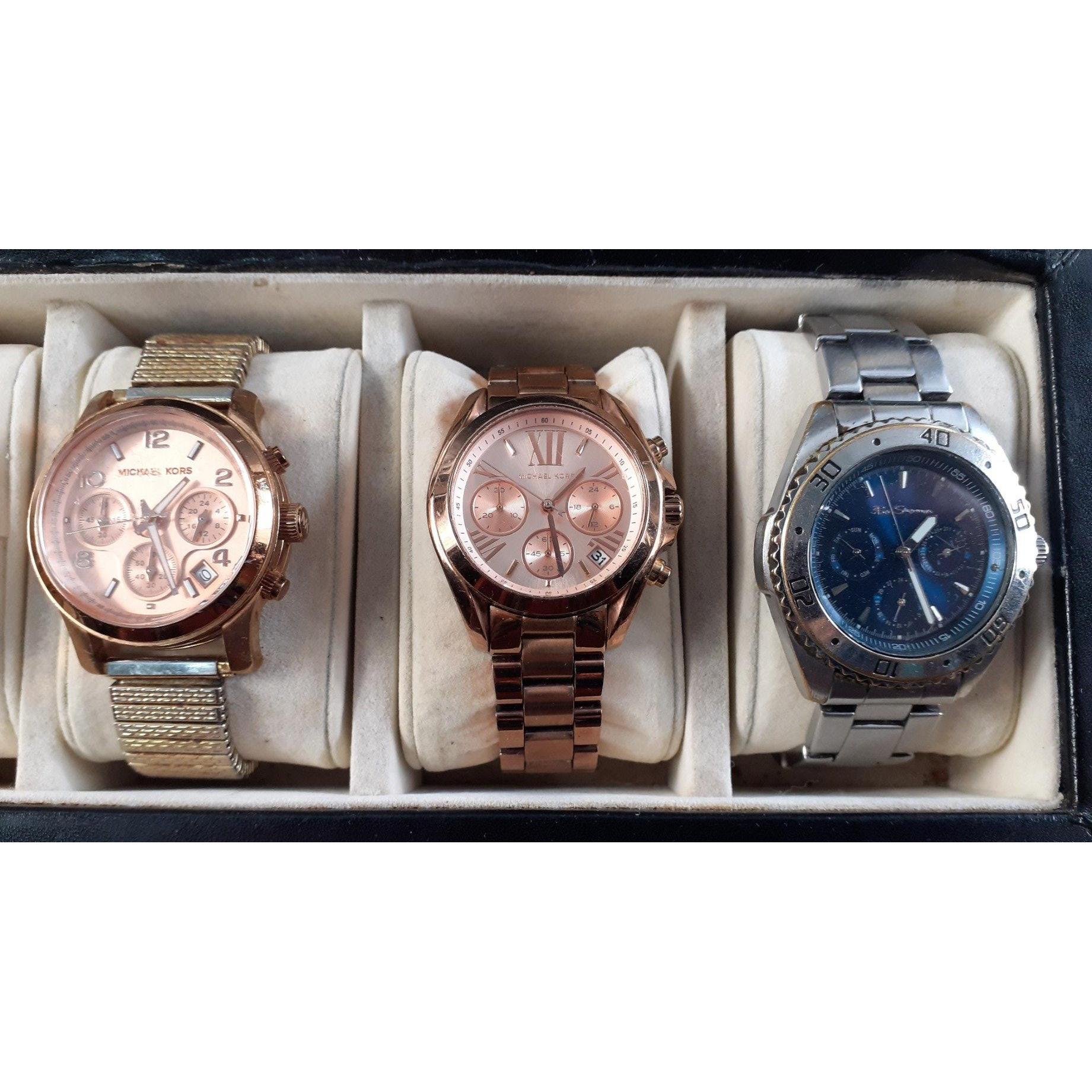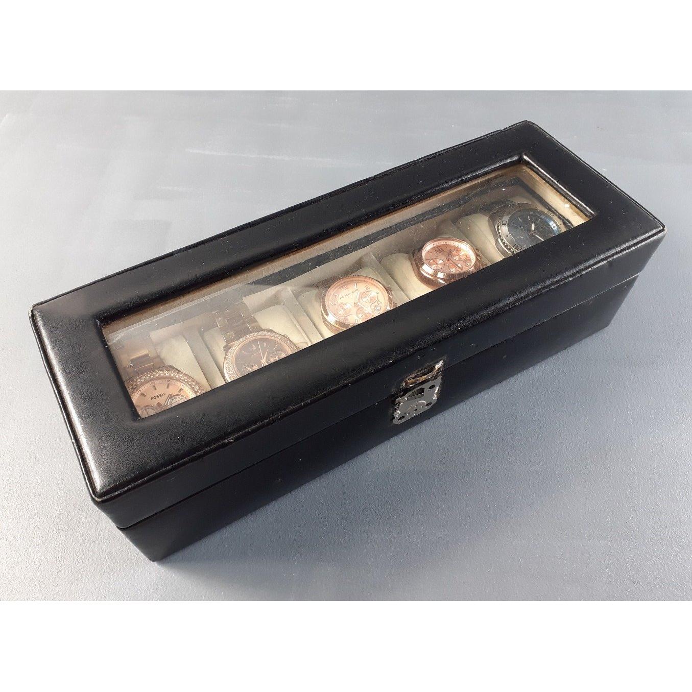 A watch storage box with five modern dress watches. MICHAEL KORS x 2, FOSSIL, BEN SHARMAN, DKNY. All ticking away at valuation. Approx 5 pieces
