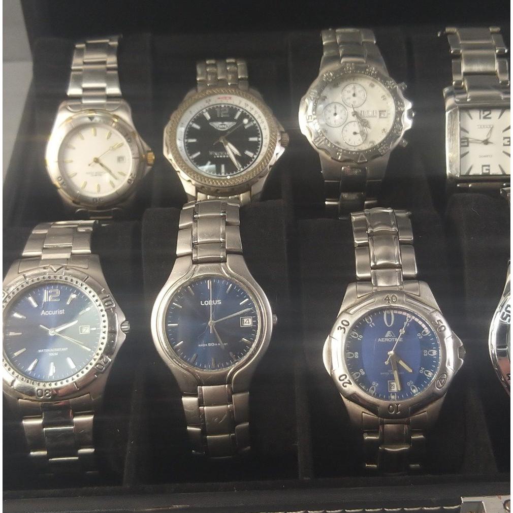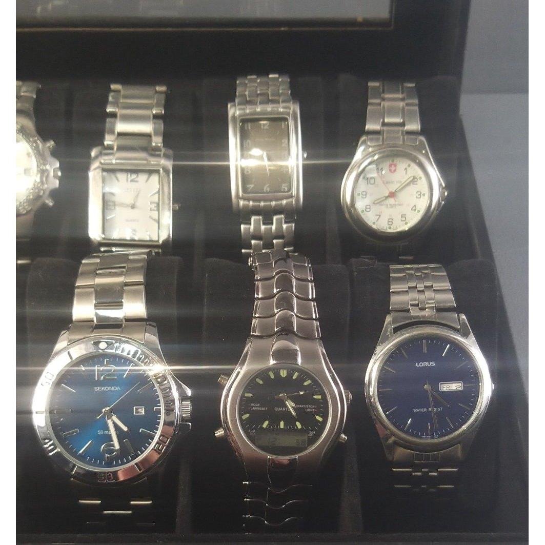 A padded watch box with twelve modern dress watches. ACCURIST, LORS, SEKONDA and much else. Most appear to be working at valuation but batteries may be required. Approx 12 pieces