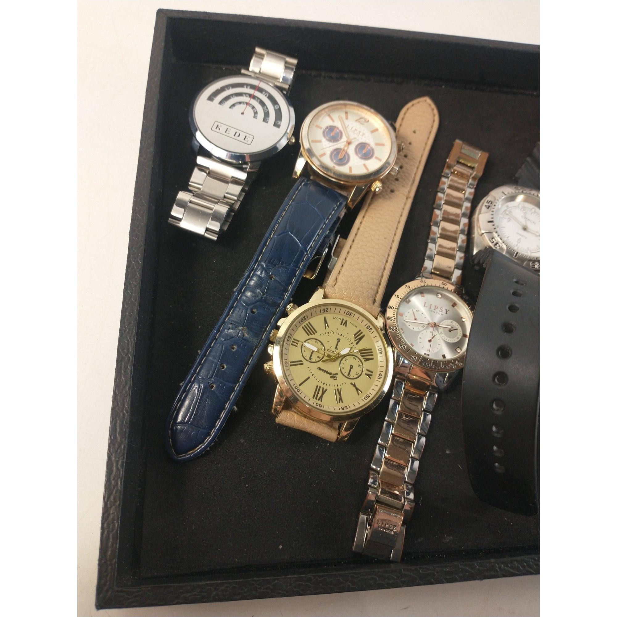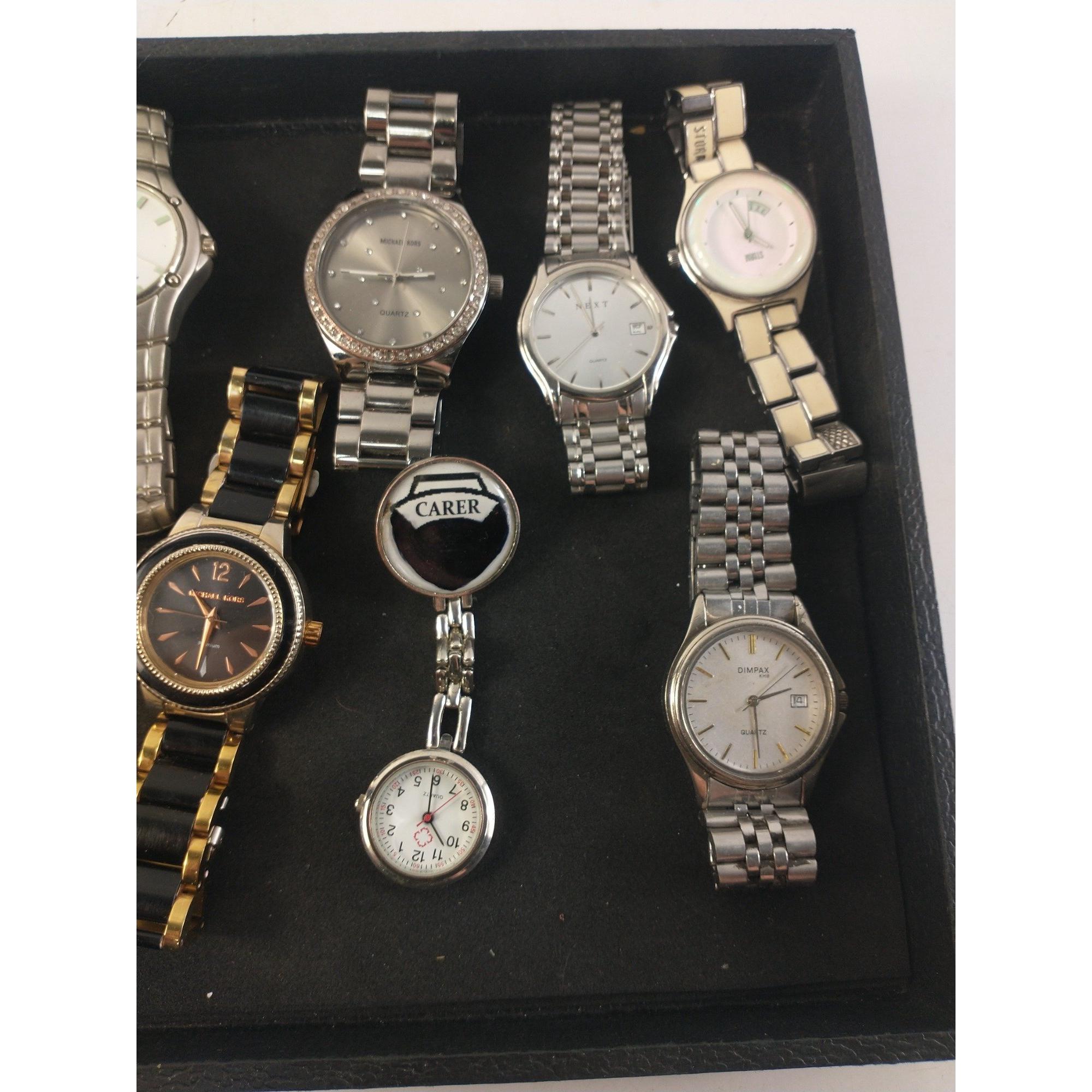 A tray with a selection of over twelve modern dress watches. Makes such as NEXT, DIMPAX, MICHAEL KORS and much else. My require batteries.
