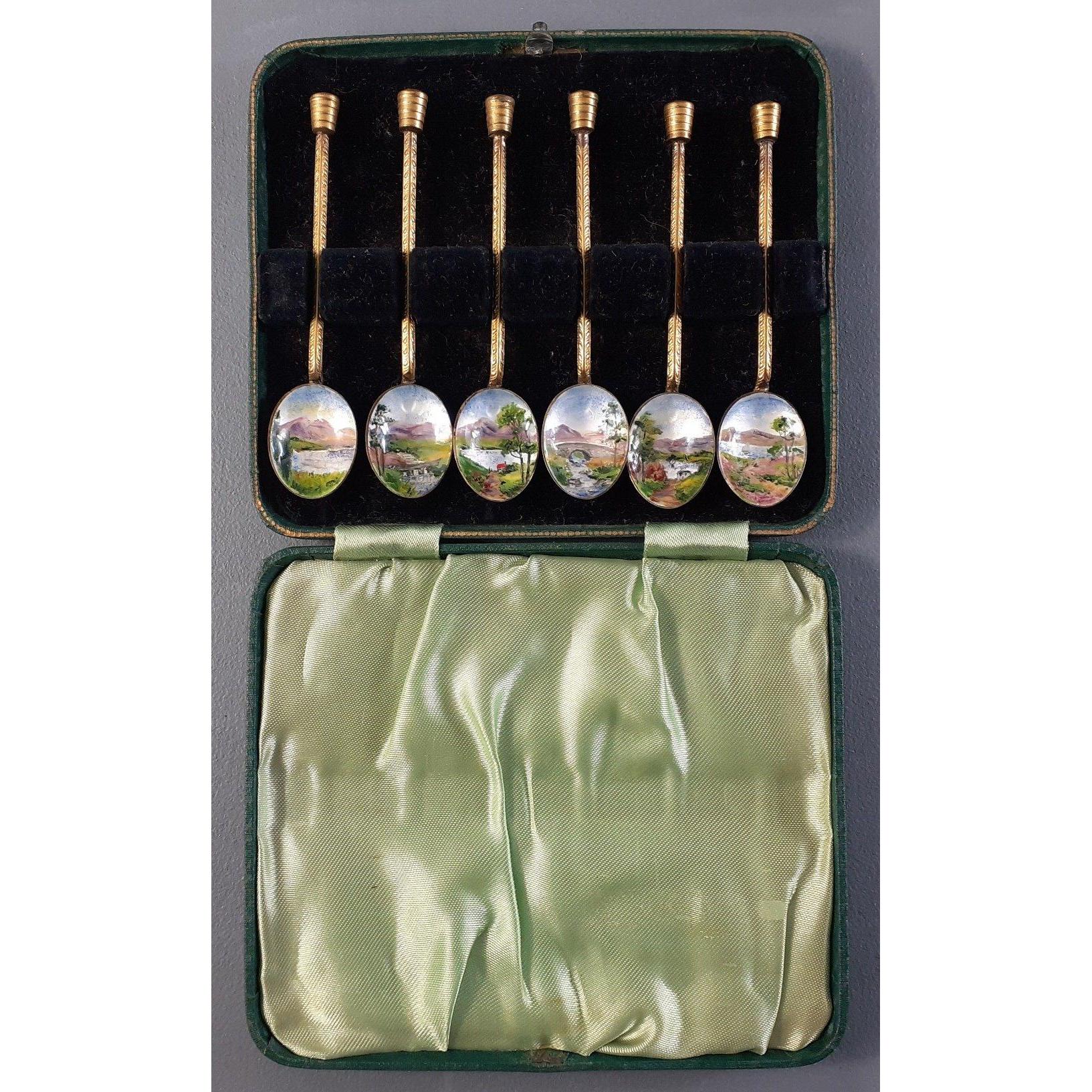 A very pretty cased set of gilt teaspoons with painted enamel possibly Highland scenes to bowls, all different. A very unusual and interesting set, nicely presented in case.