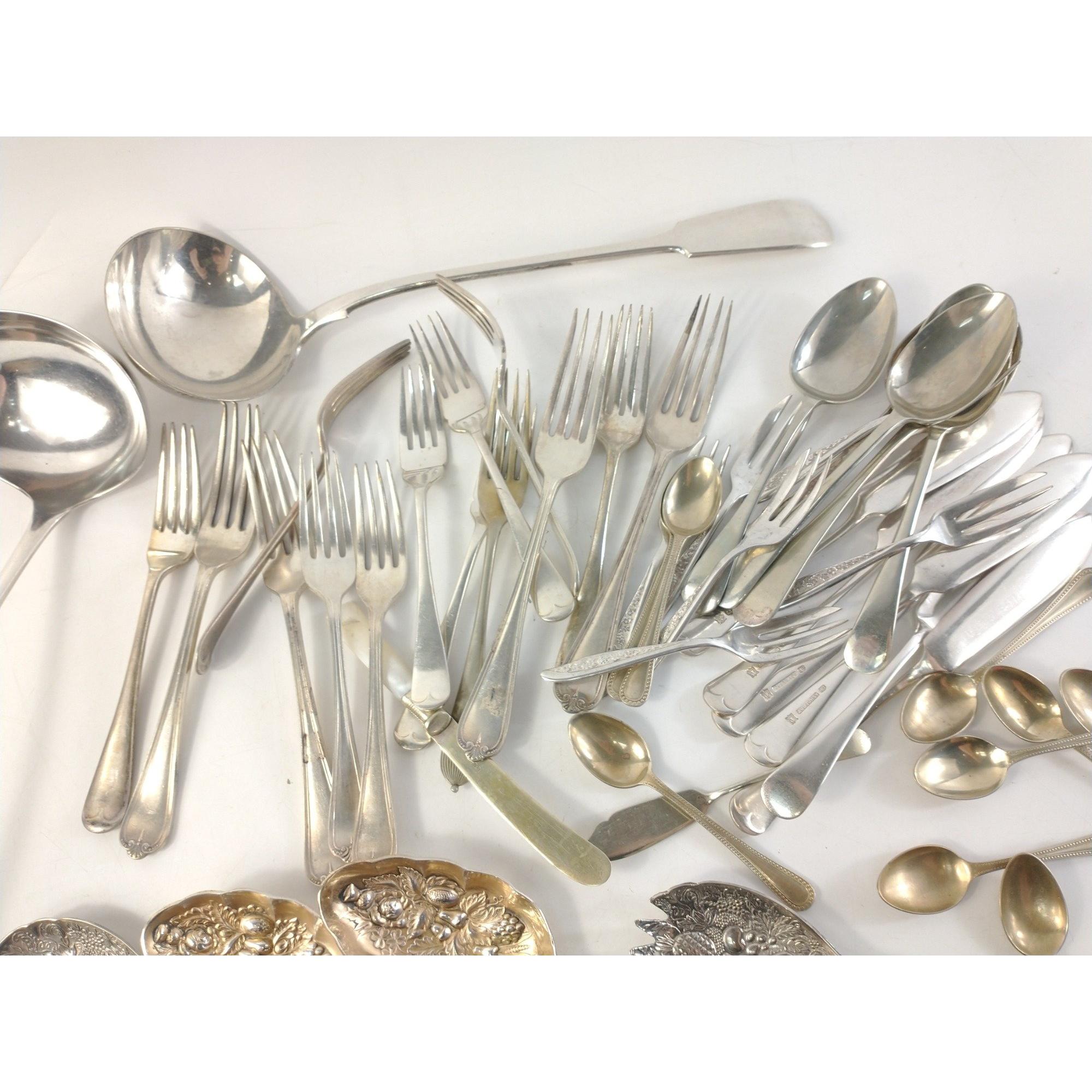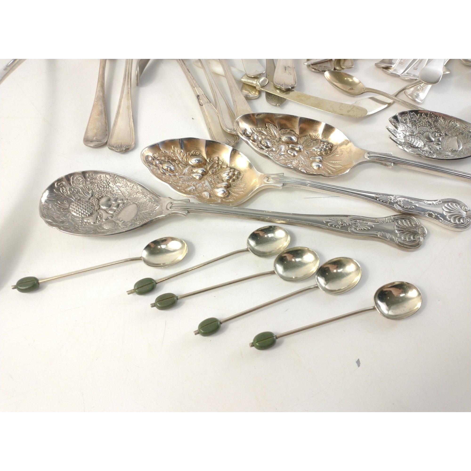 A small lot of silver plated flatware to include two ladles, some Queen's pattern and other flatware.