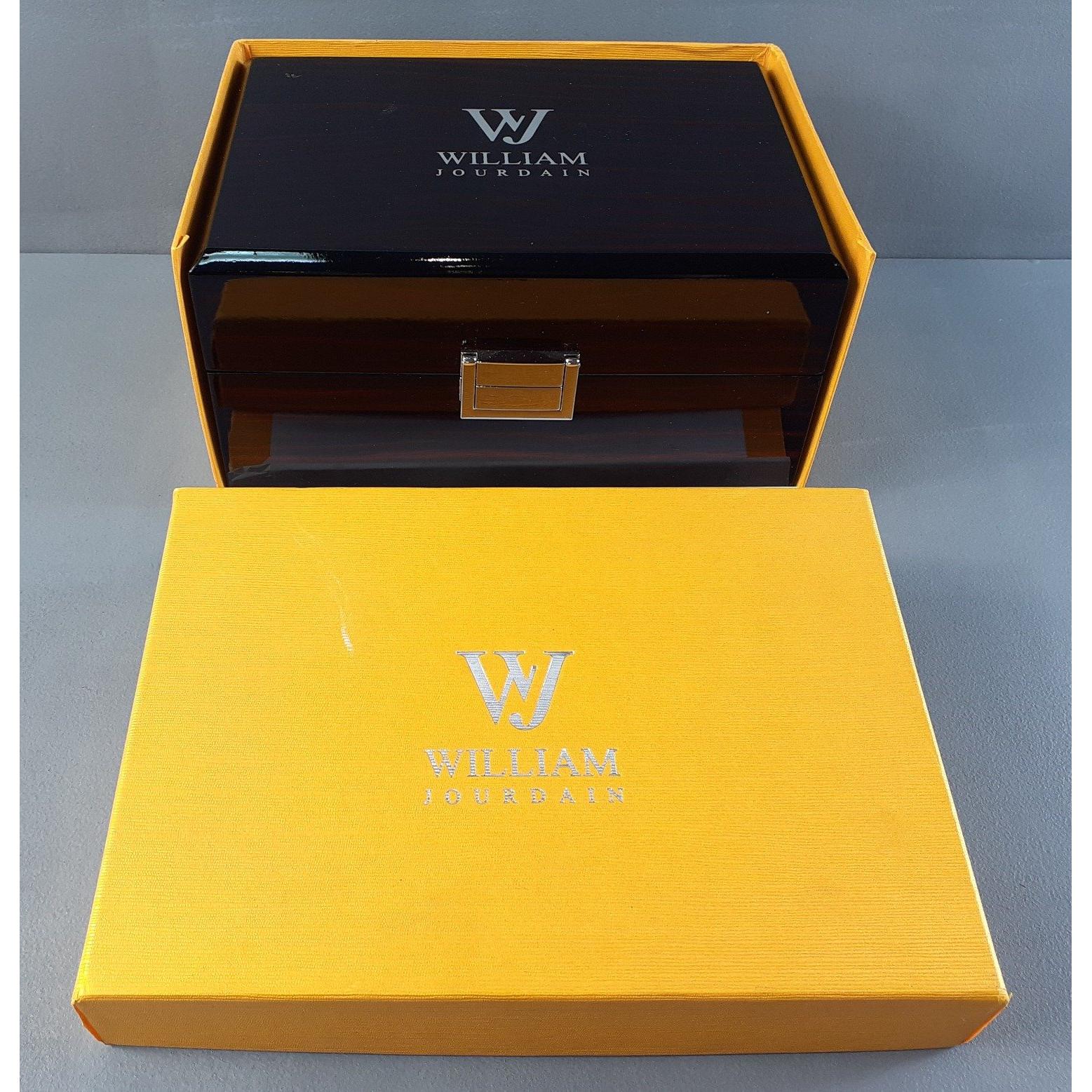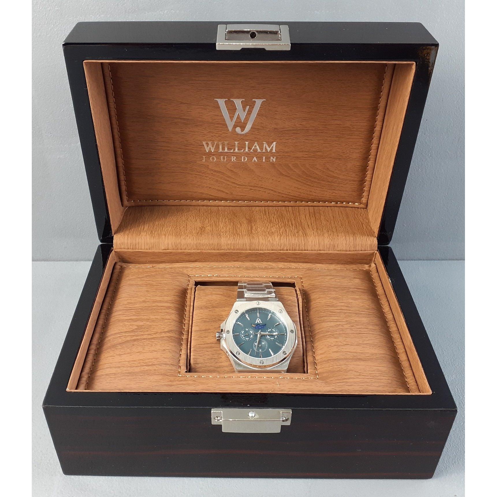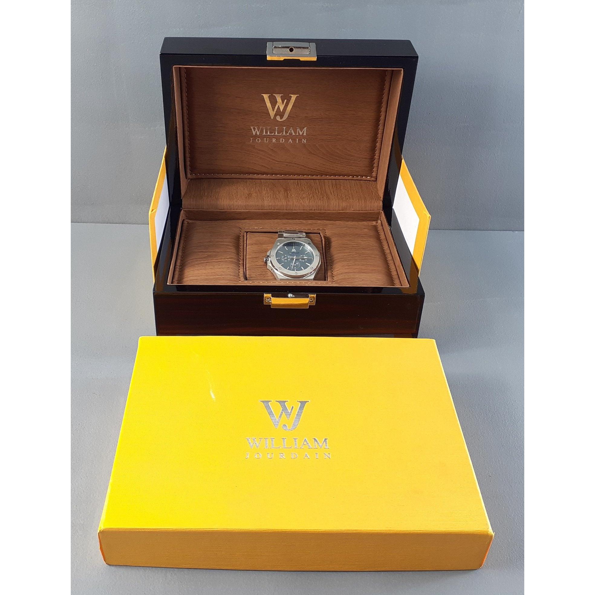 Lovely and stylish WILLIAM JOURDAIN stainless steel wrist watch in beautiful wooden box. New with spacer on winder and plastic to strap. Model 316L running Japanes Miyota movement.