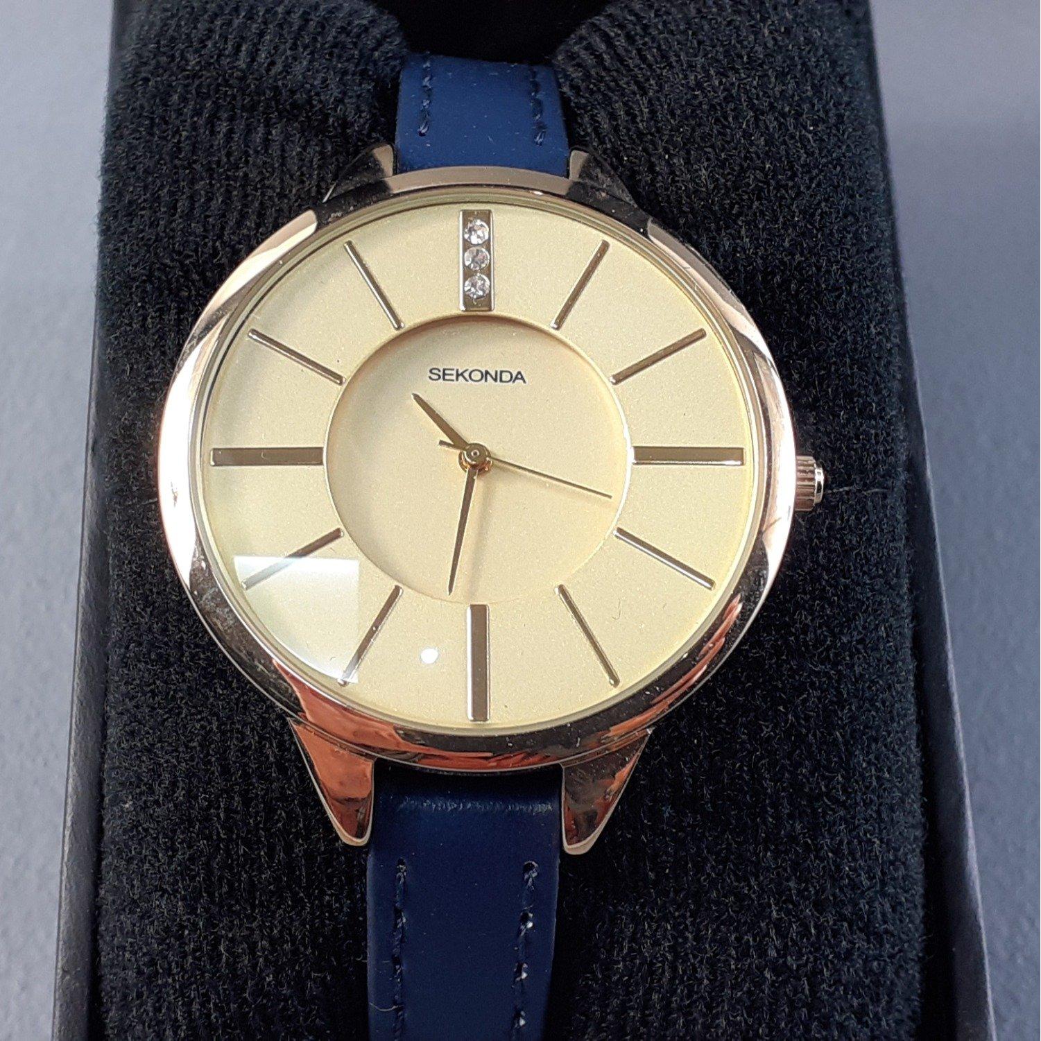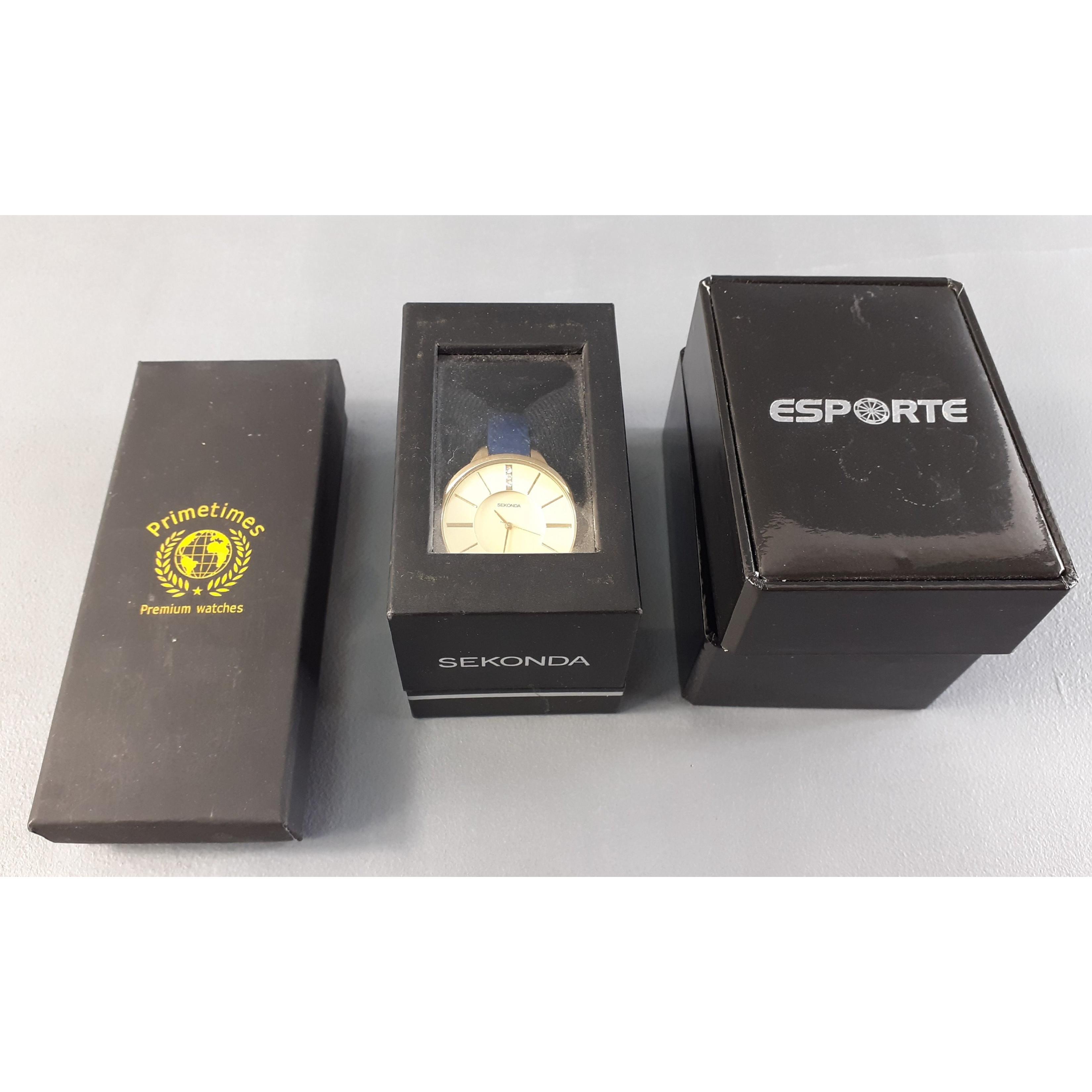 Three stylish modern watches. ESPORTE quartz dartboard faced watch, SEKONDA slim quartz and a PRIMETIMES Mariner heavy bracelet watch still in polastic. Batteries may be required. Approx 3 pieces