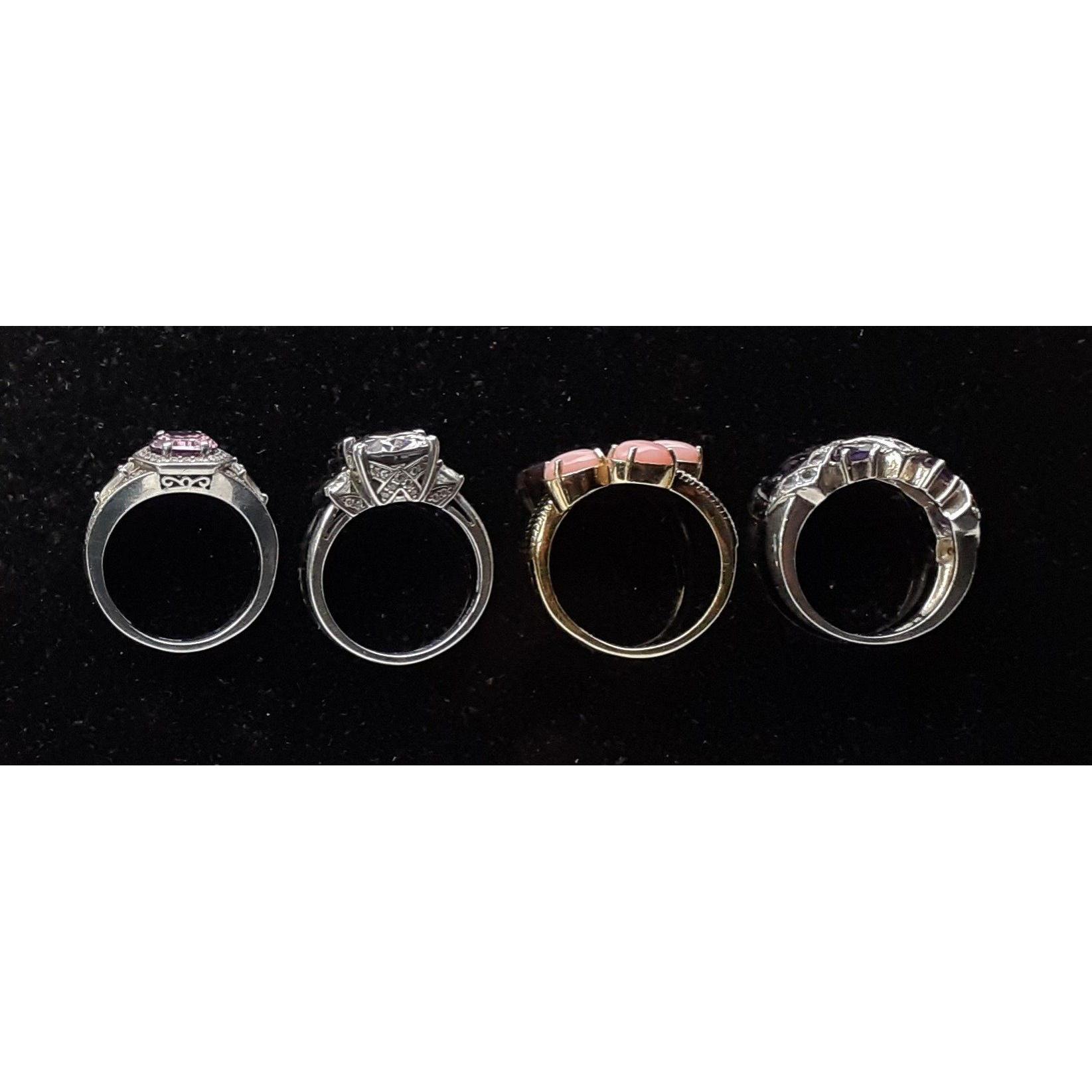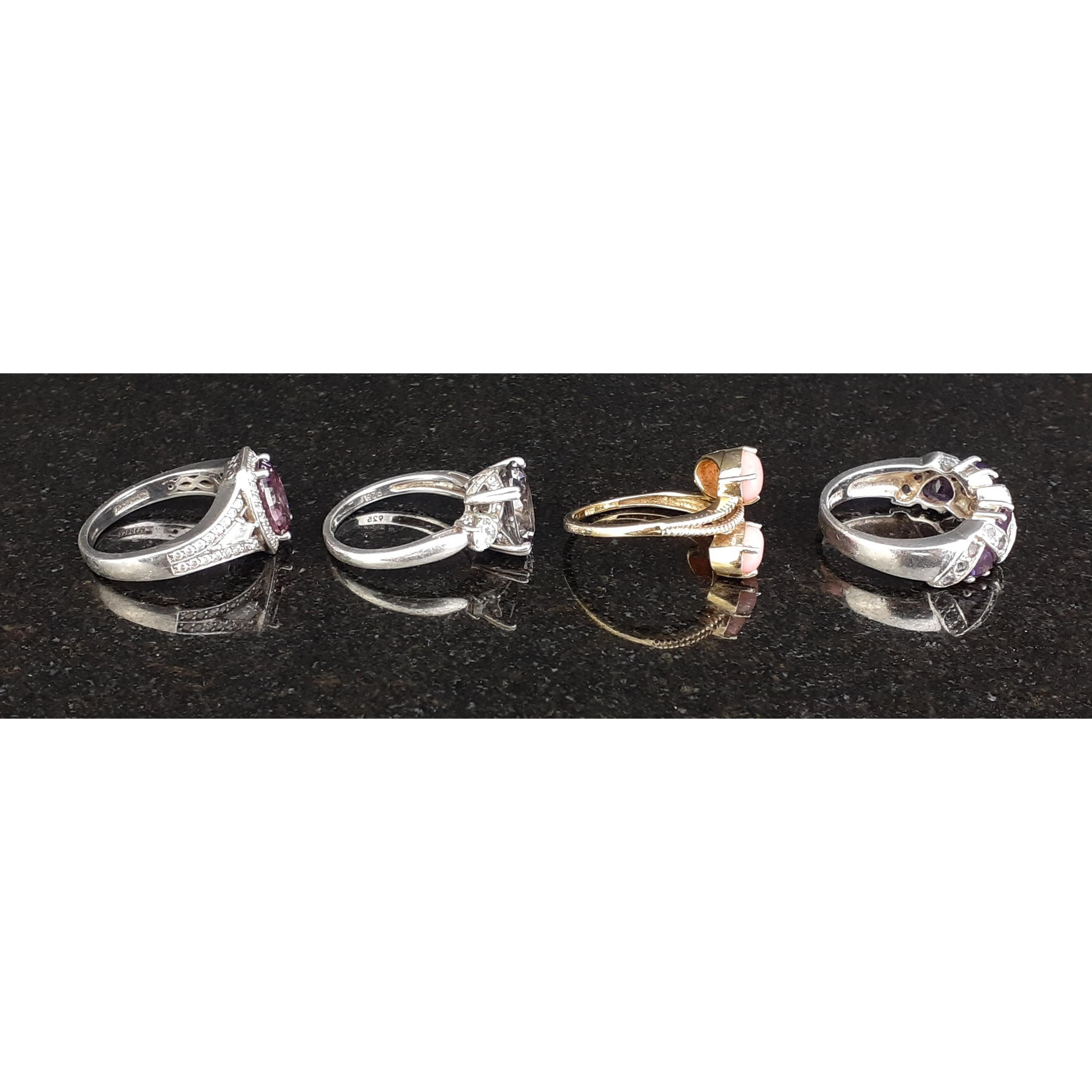 Collection of four 925 rings. Styles include three pink stone size S, rich purple central stone surronded by white stone with 2 unusual kite cut stones sie Q, pale purple stone with unusual bow style surround flanked by 2 white stones size Q, deep purple trillion cut stones with zigzag pale purple stones size Q. Weight: 22g approx