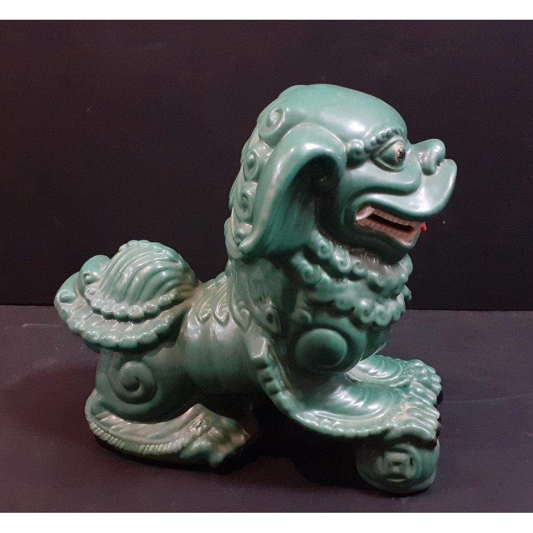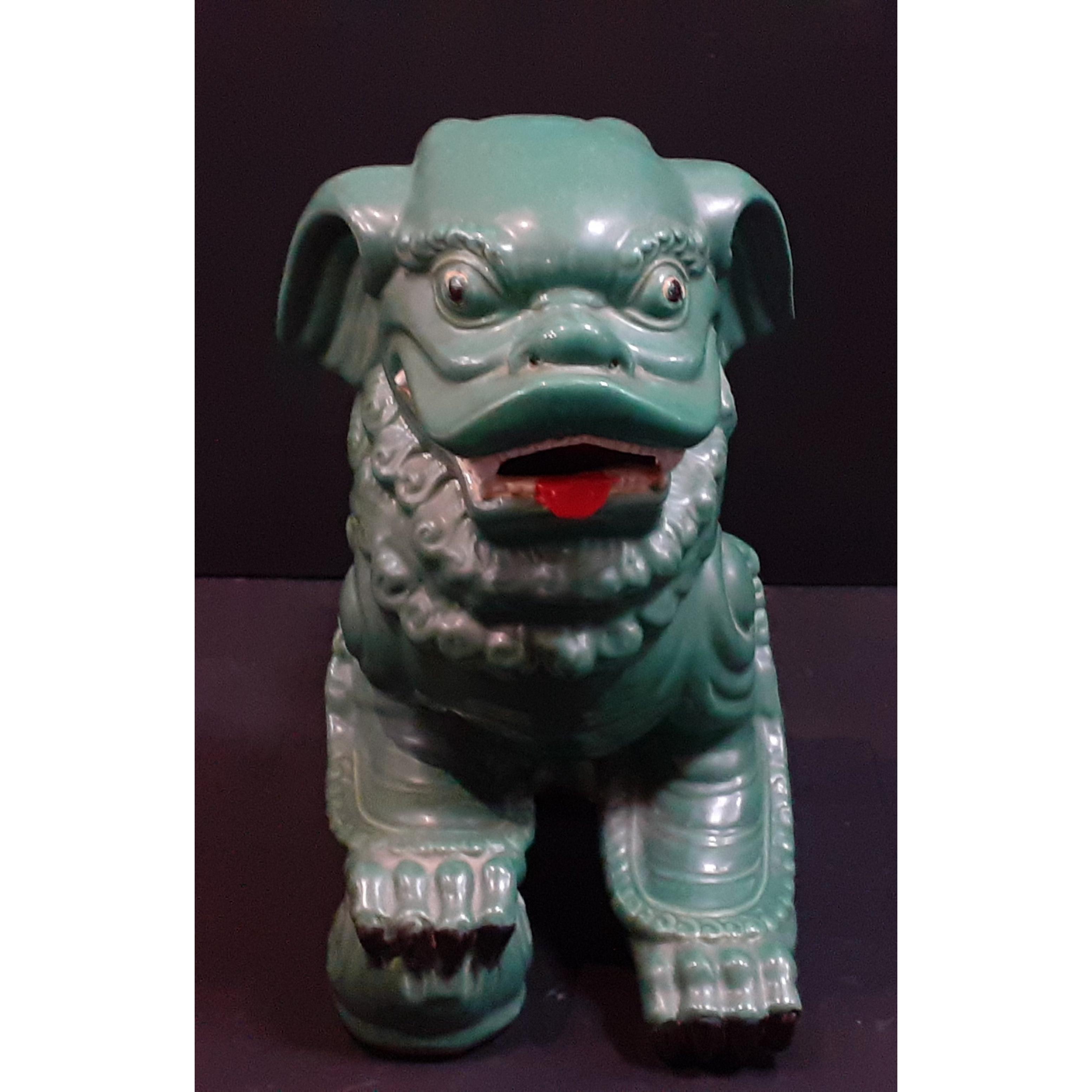 A SUBSTANTIAL and impressive FOO DOG in green ceramic finish. Height 43cm, length 45cm approx.