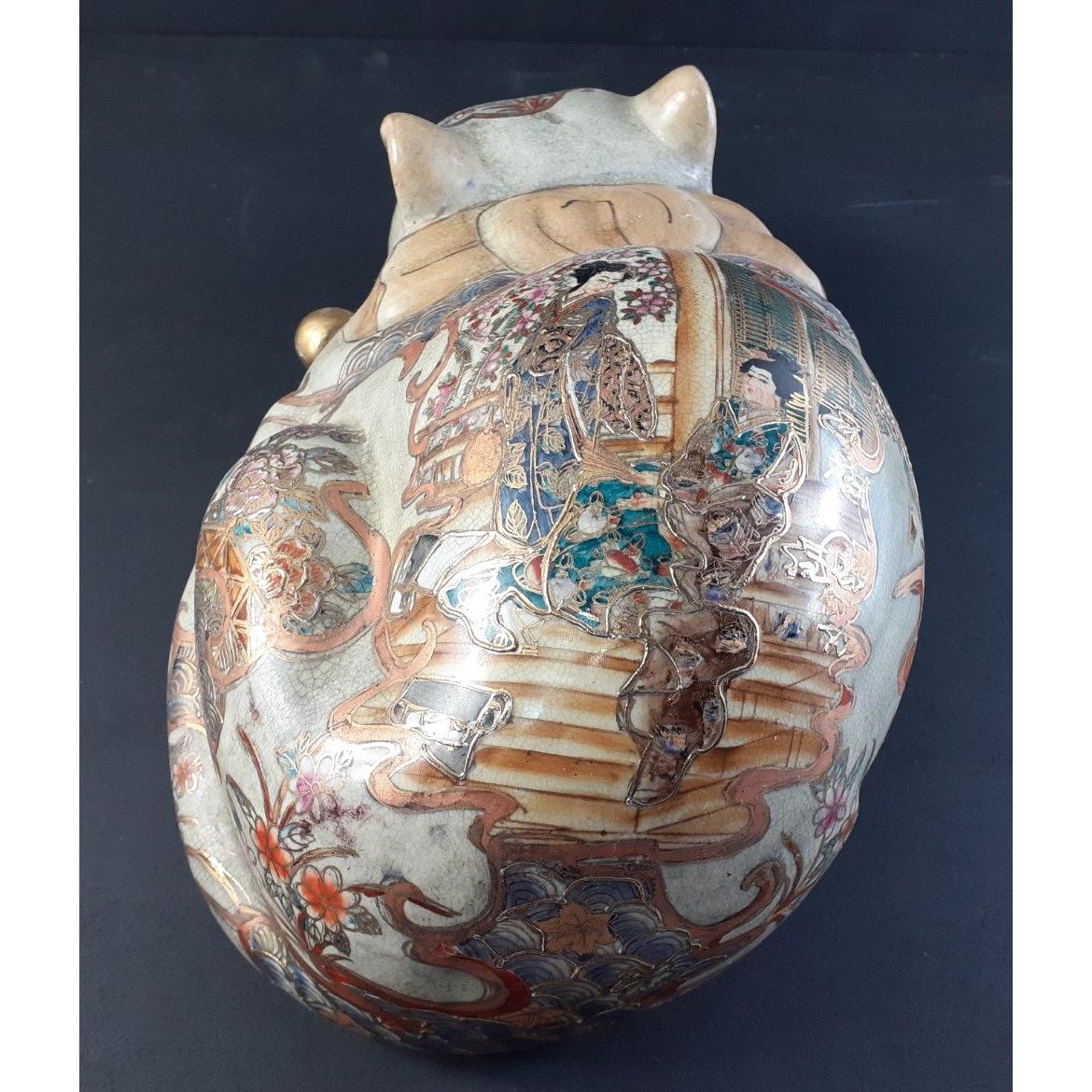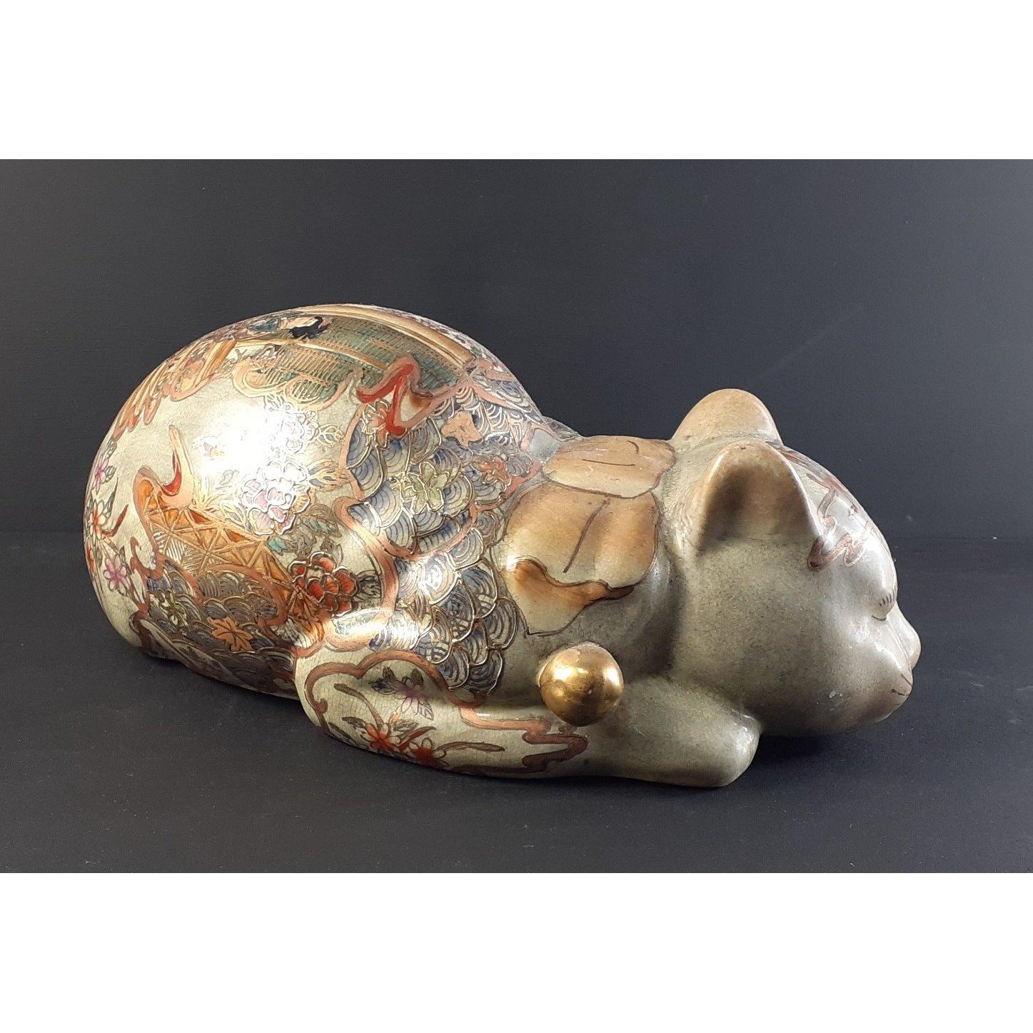 A lovely highly decorated Oriental ceramic cat with Geisha design. 35cm long.