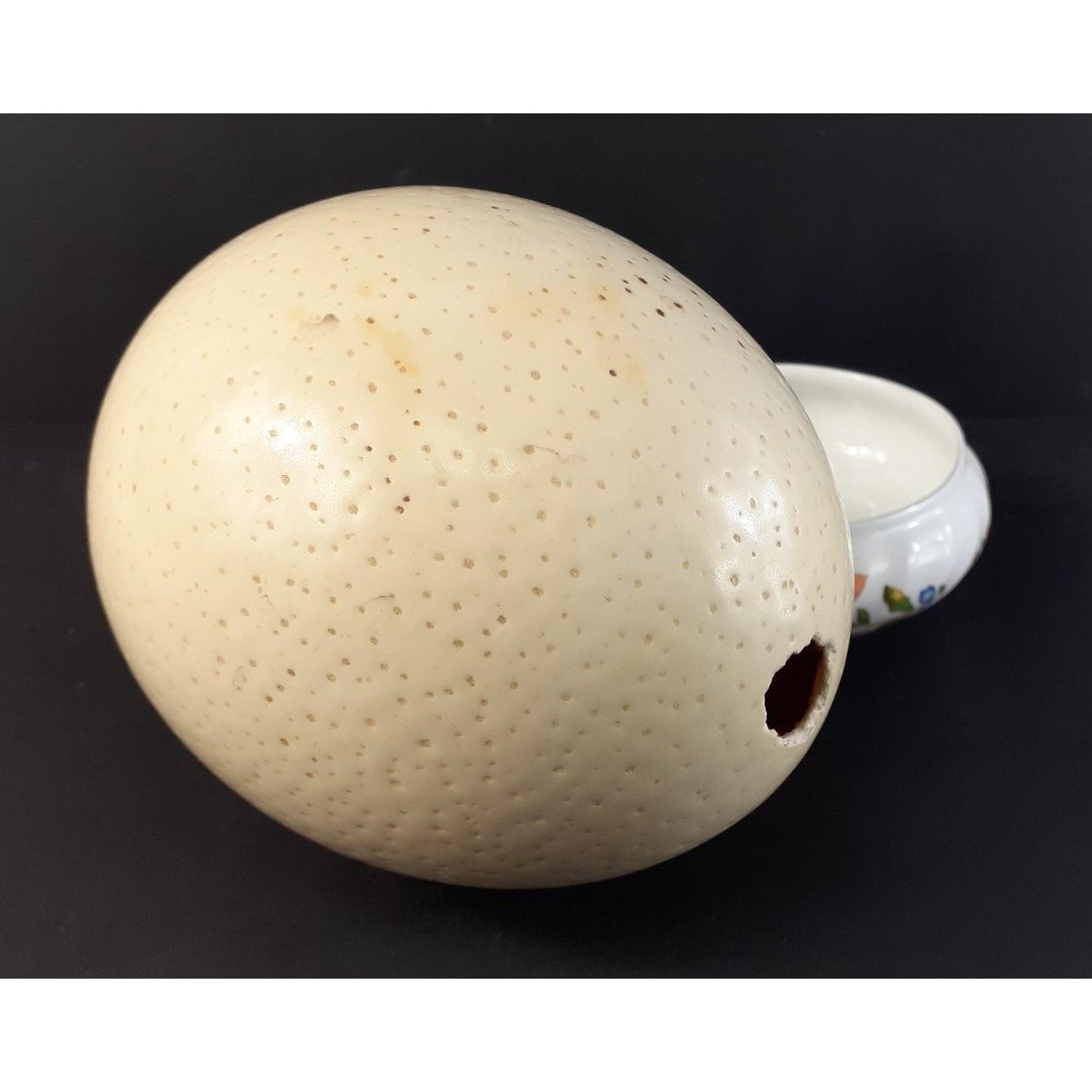 An Ostrich egg on a decorative ceramic plinth, 16cm.