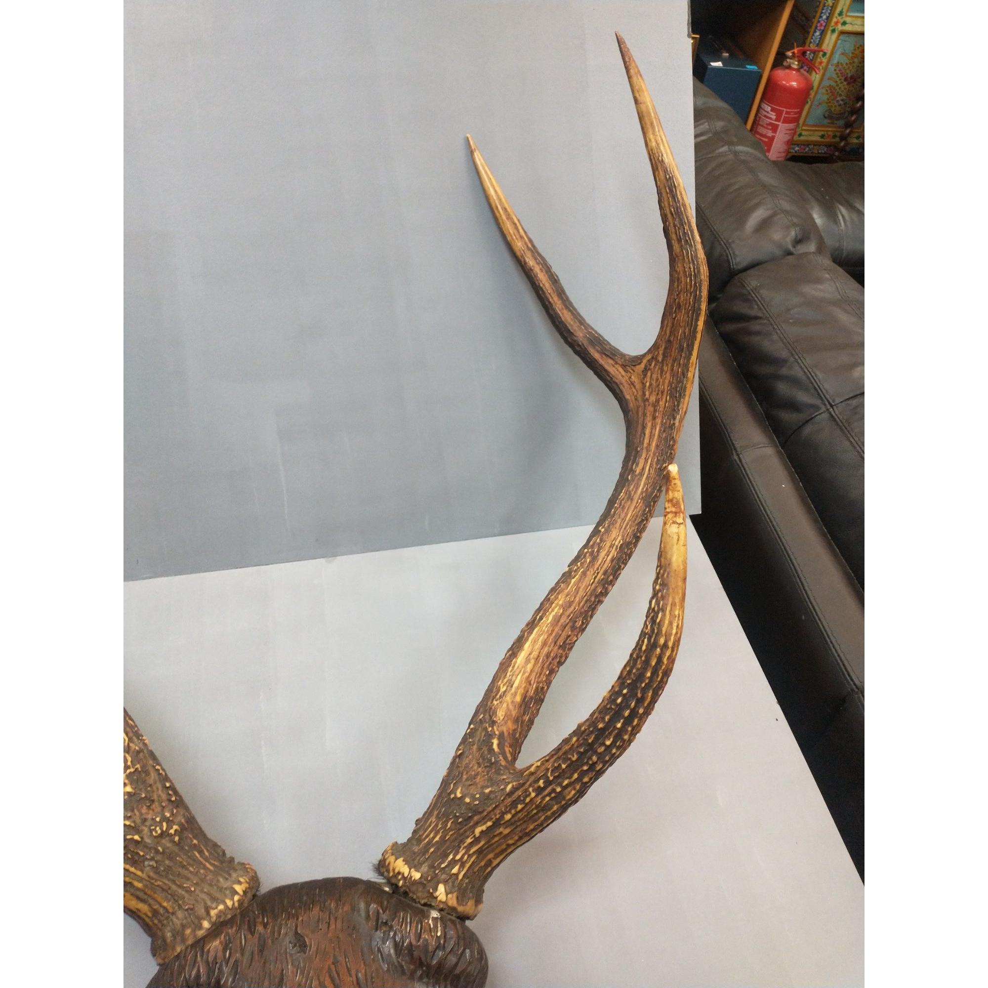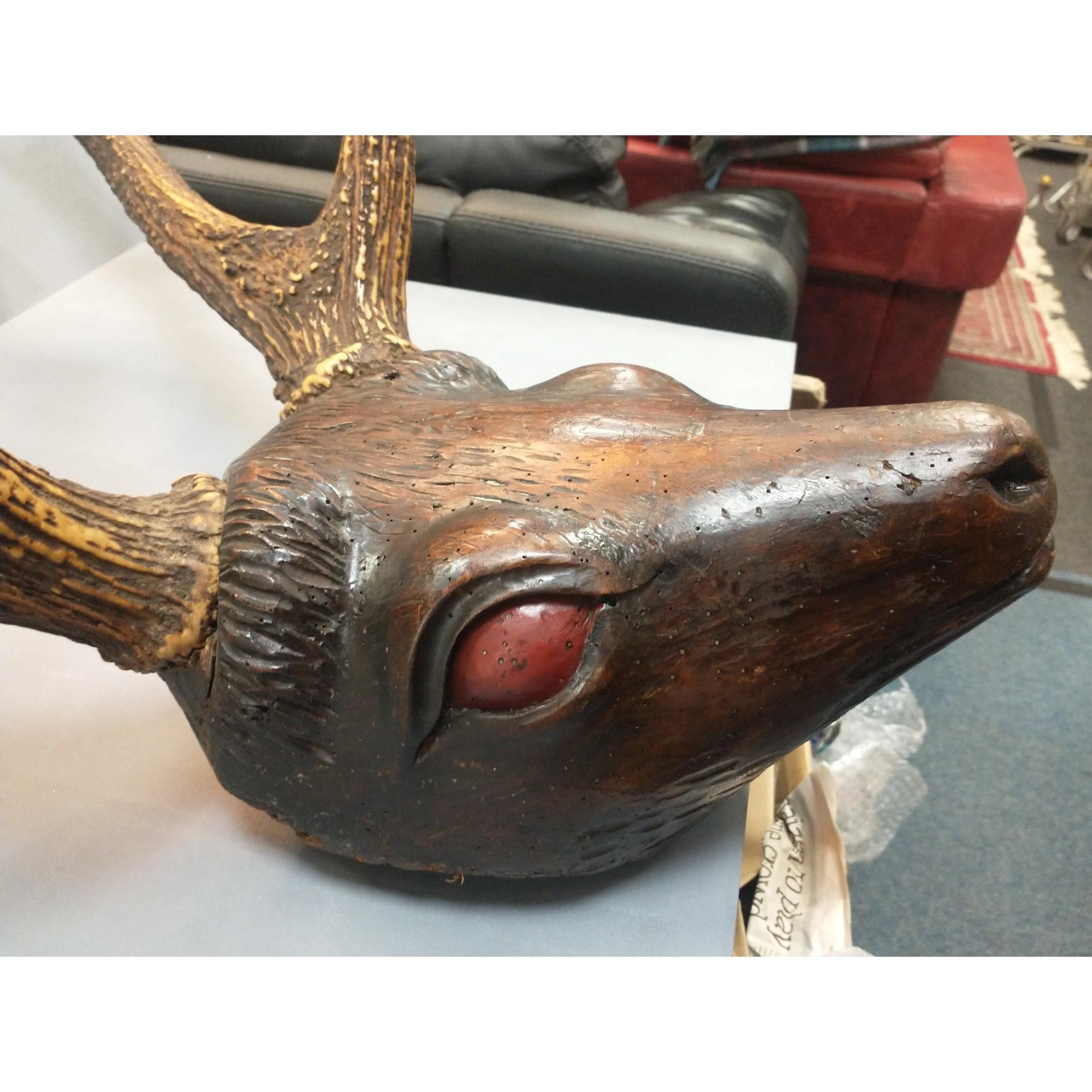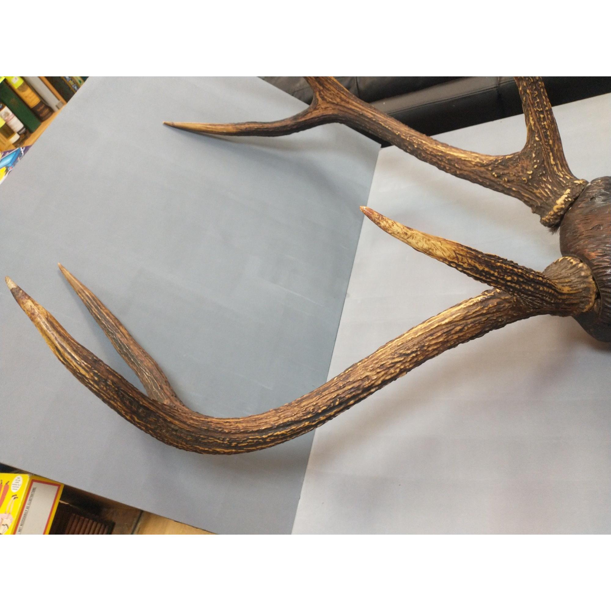 A very unusual antique hand carved Black Forest Deer head with original large six point antlers. The whole standing 1m approx. A very impressive piece