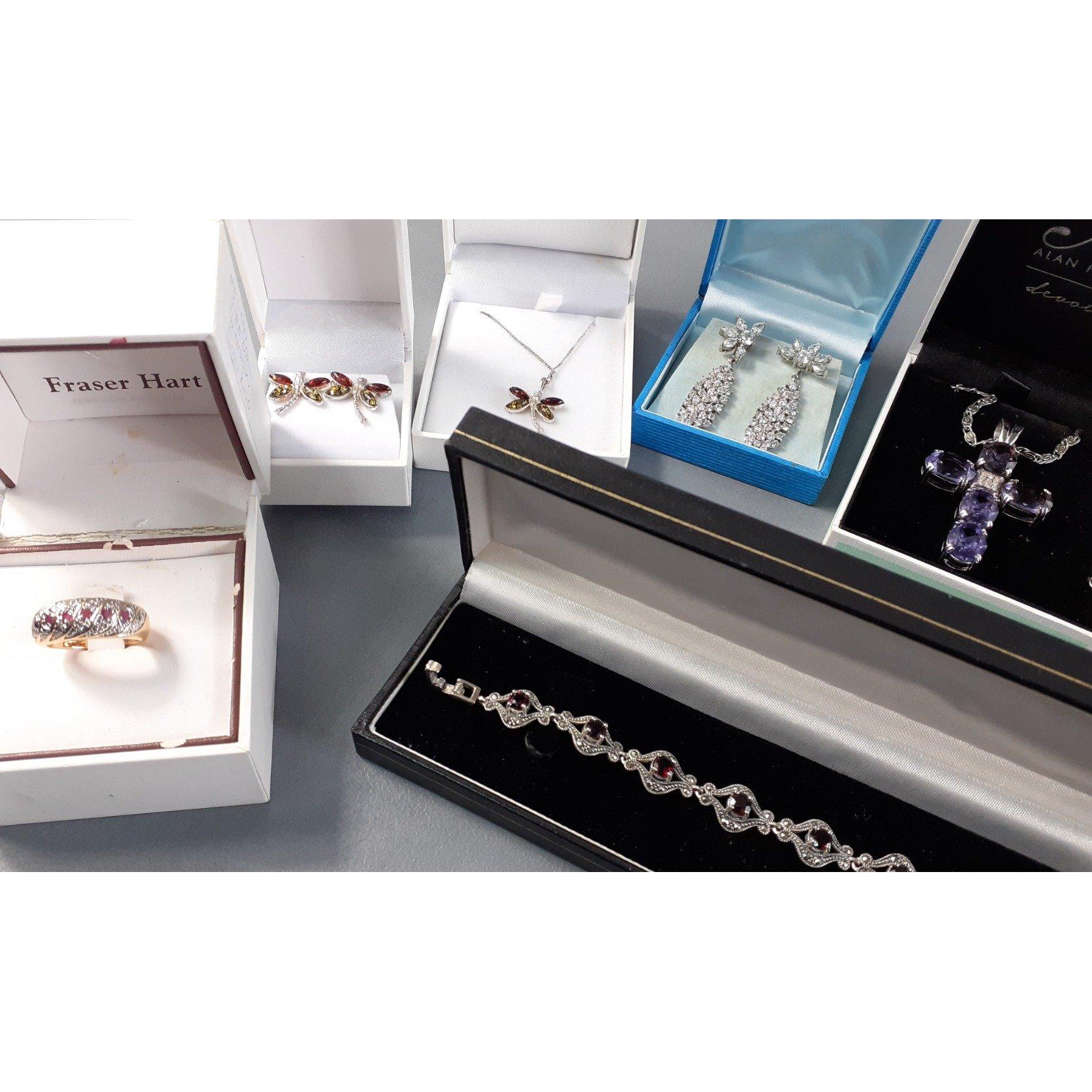A collection of boxed costume jewellery to include bracelets, necklaces, a ring, a set of earrings and pendant, an impressive marcasite brooch, etc