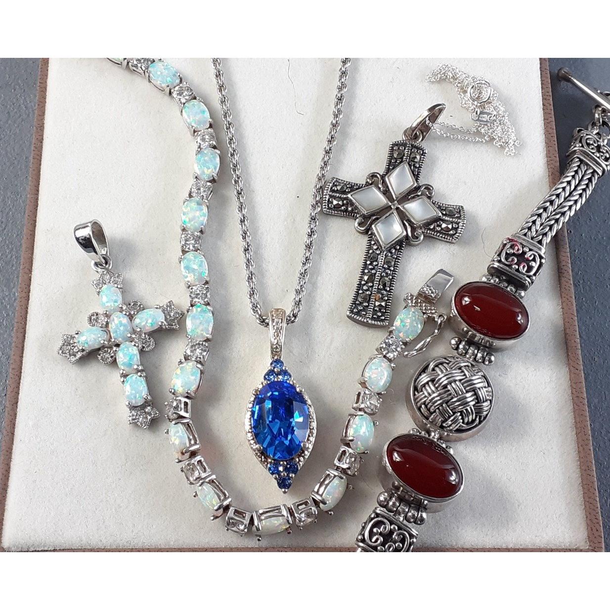 A nice collection of jewellery stamped 925 to include 2 crosses, one set with opalescent stones the other marcasite, a necklace and earrings set with blue teardrop stones, a bracelet set with opals and clear stones (19cm approx),