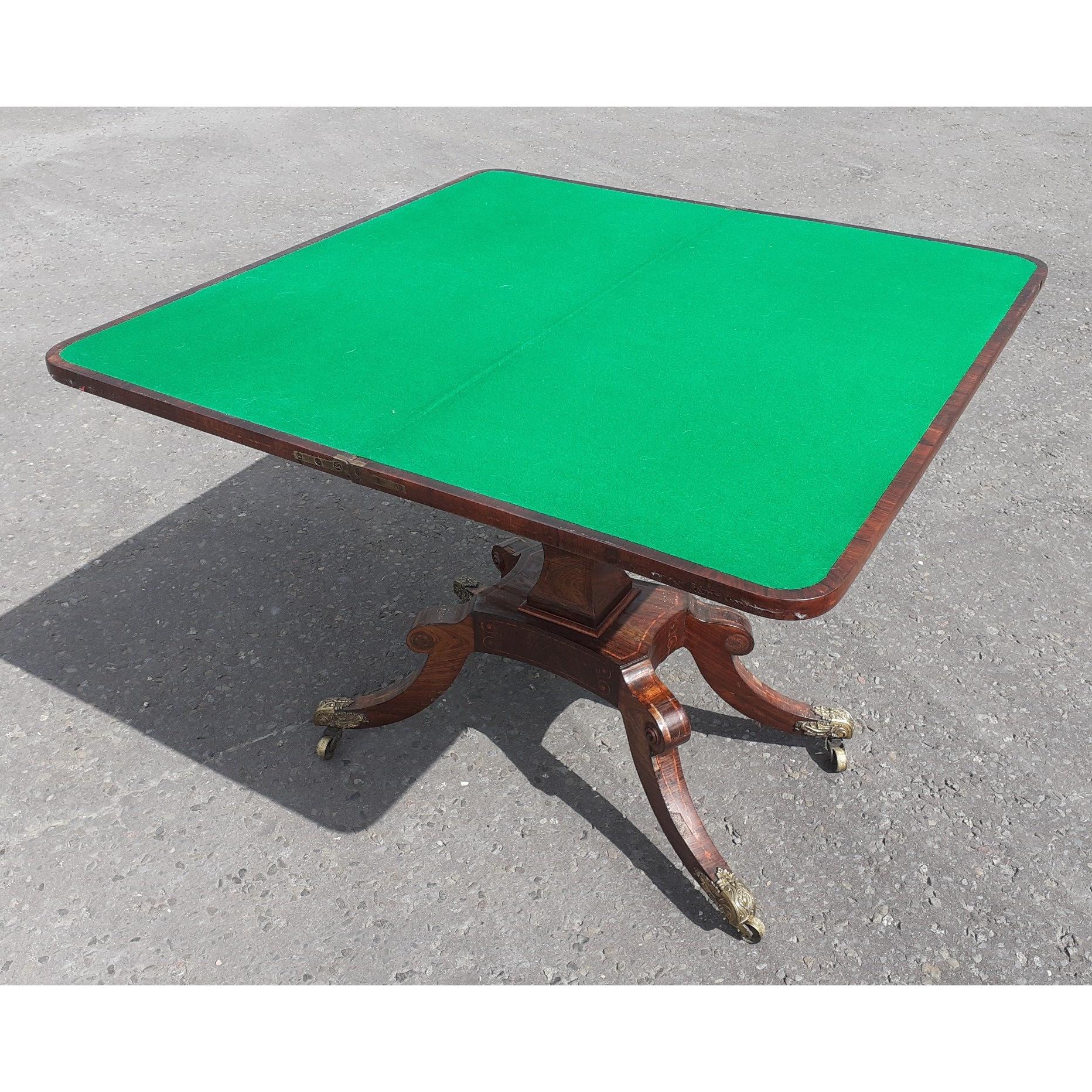 A very pretty twist top free standing baize card table of some merit. Top 90cm x 45cm folded. Stands 75cm tall. Elaborate carving and nice quality castors. A lovely example.