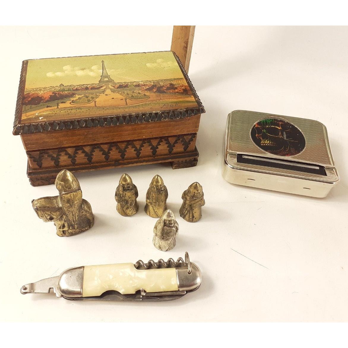 A mixed lot to include a Paris music box, a glass washboard, a few brass chess pieces, cigarette case, a jewellery box for displaying rings and a penknife.