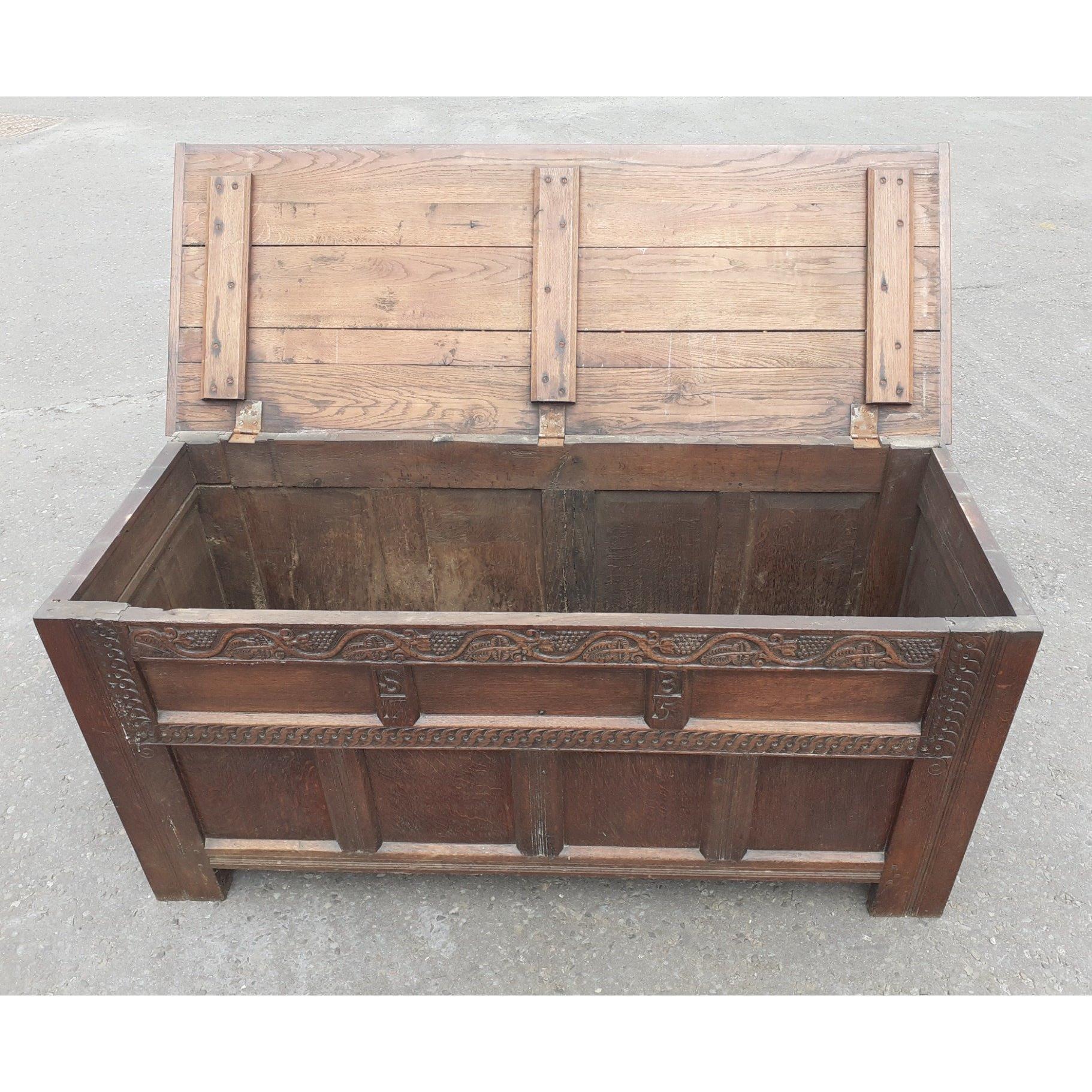 Carved oak coffer with marquetry and carved initials. 155cm wide, 60cm deep, 70cm tall approx.