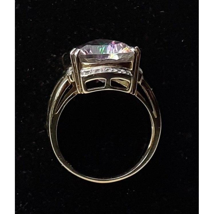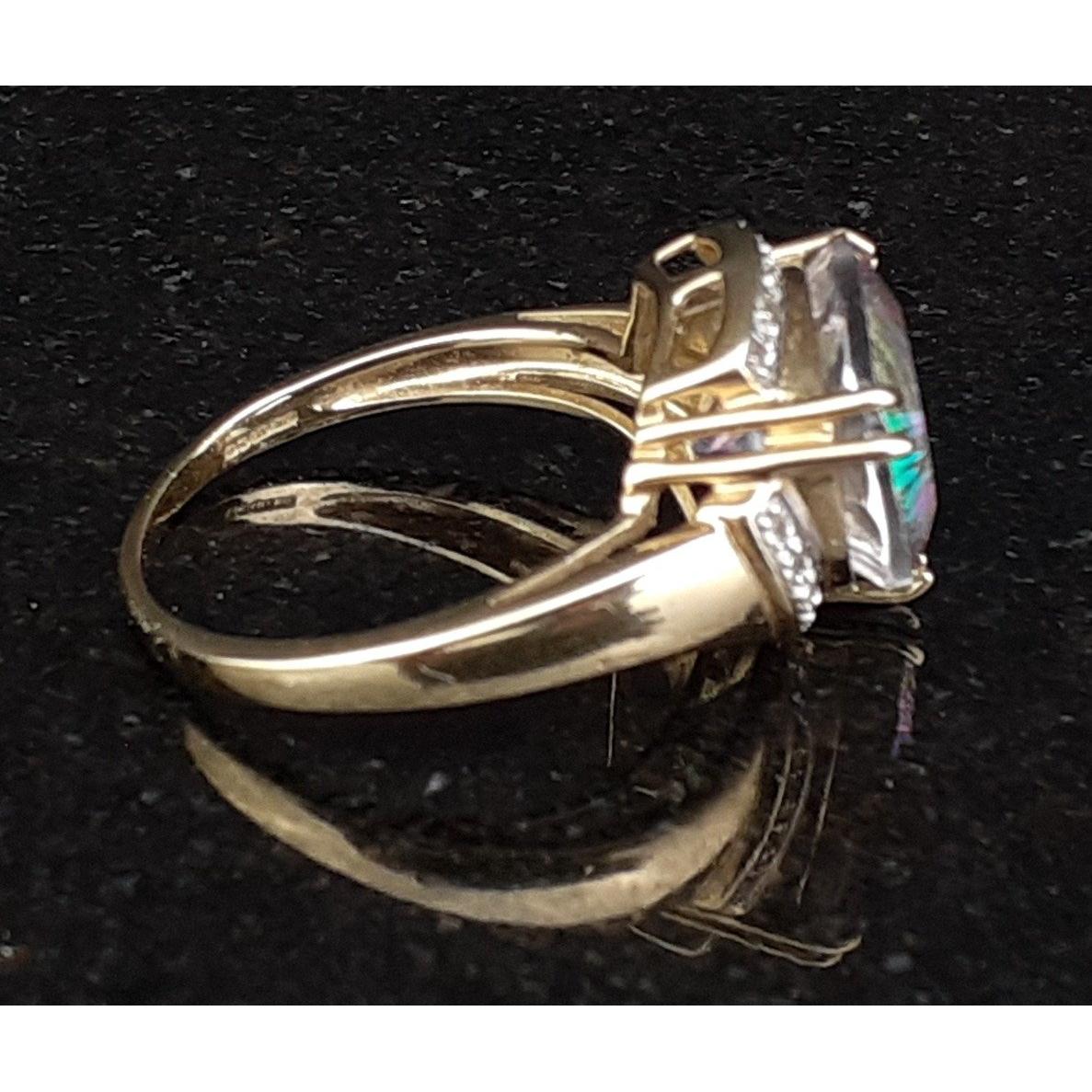 A DK dress ring hallmarked ring stamped 375 set with a multi-faceted triangular stone and surrounded by clear stones. Size Q, gross weight 4.73g approxApprox 1 pieces