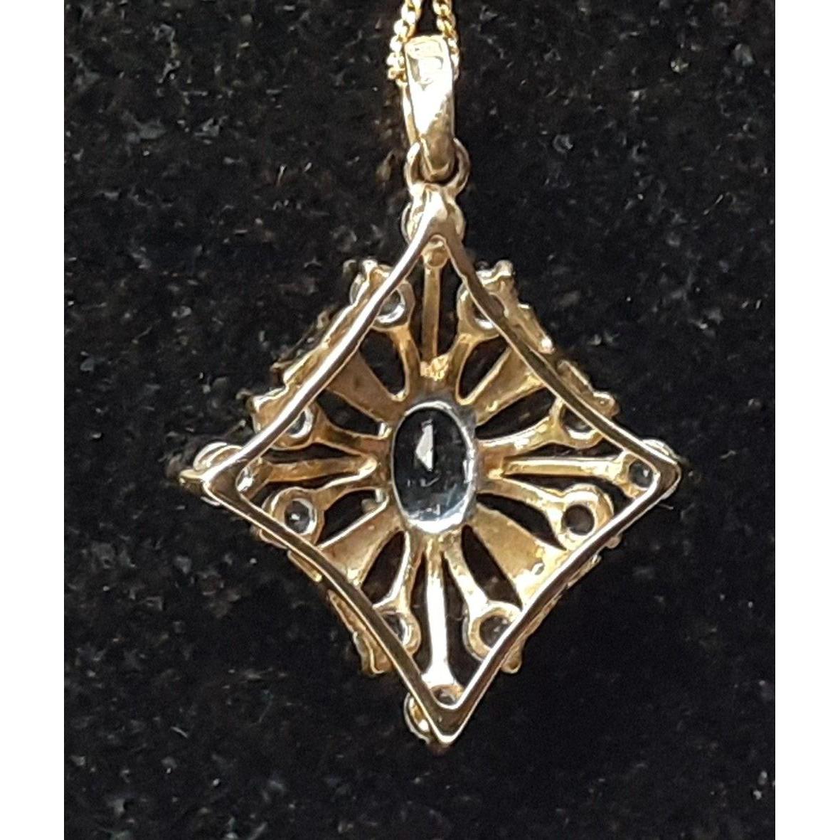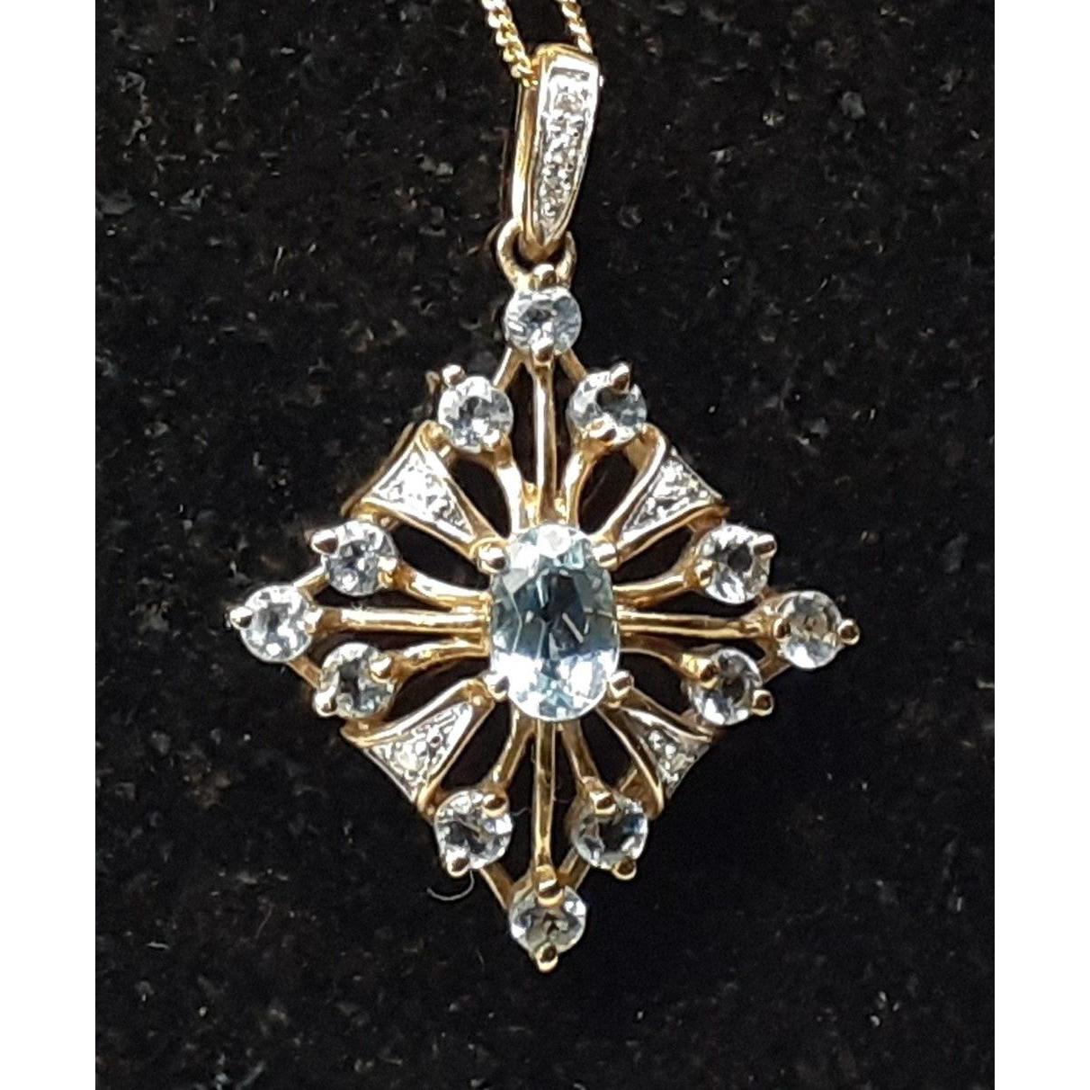 A 9K pendant (20mm approx) in a diamond star burst design set with 12 pale blue stones on a fine chain stamped 375 (45cm long approx). Gross weight 2.60g approxApprox 1 pieces