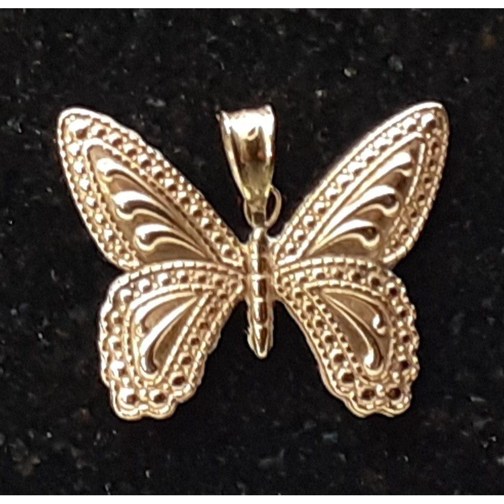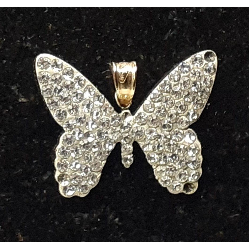 A pretty little butterfly pendant stamped 375 with 2 stones missing on one side with a 375 stamped broken chain. Gross weight 1.38g approx