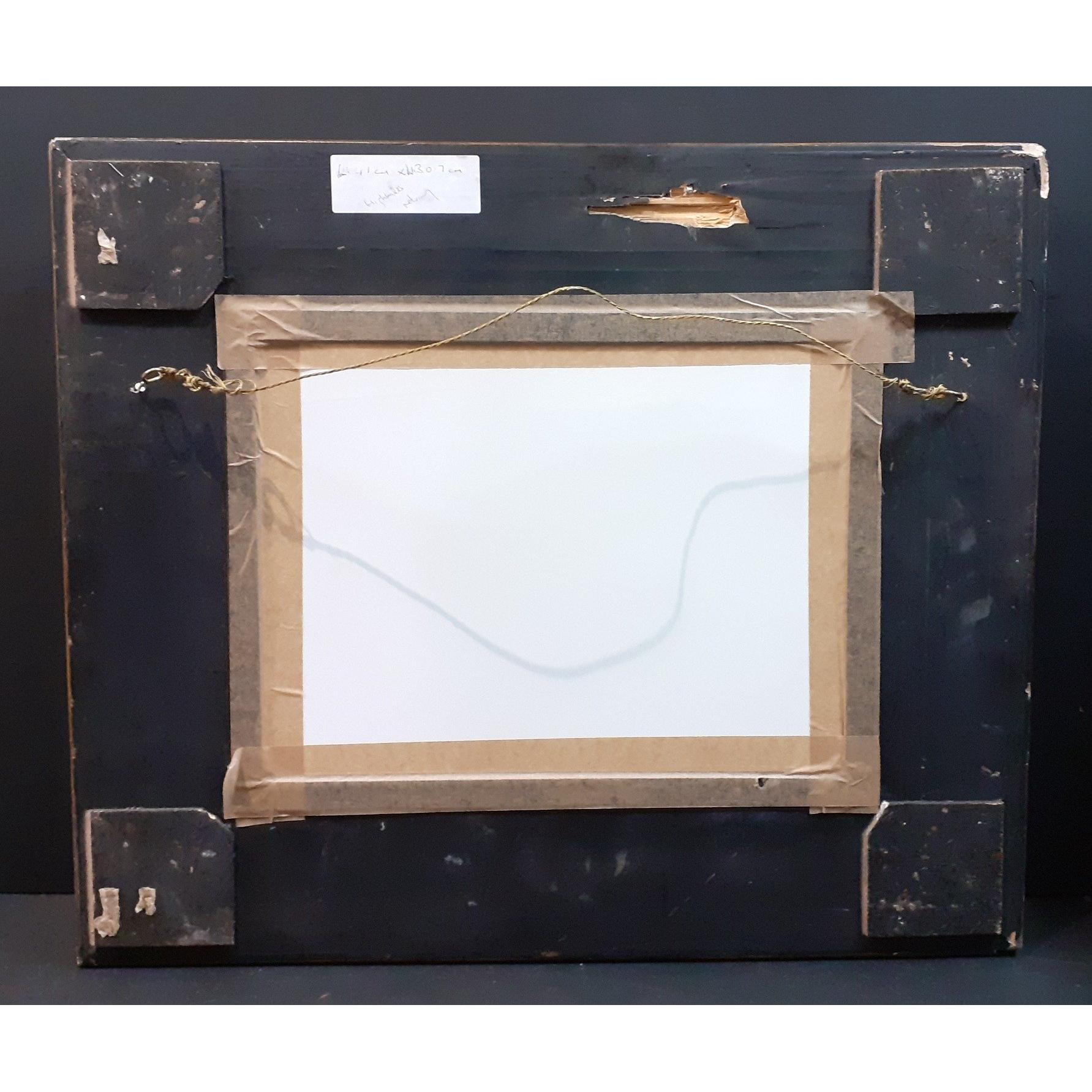 A substantial wooden gilt frame housing a print of a Highland hunting scene with white horse, stag, dogs and 2 men. Measures 68 x 58cm approxApprox 1 pieces
