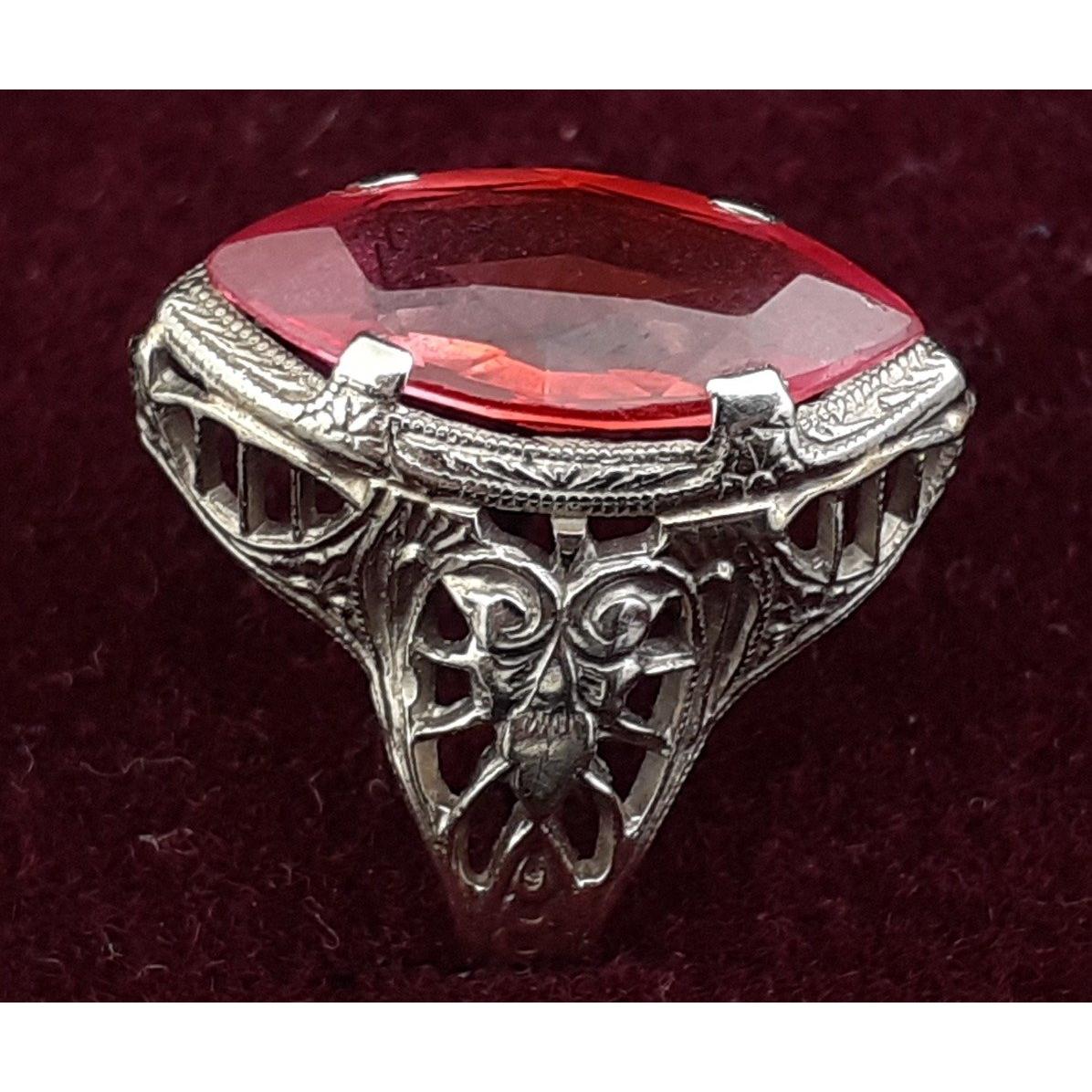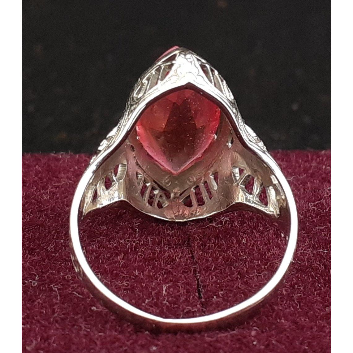 A 10K stamped ring set with a large pink stone (15mm long approx) and openwork shoulders. Size I, gross weight 2.96g approx Approx 1 pieces