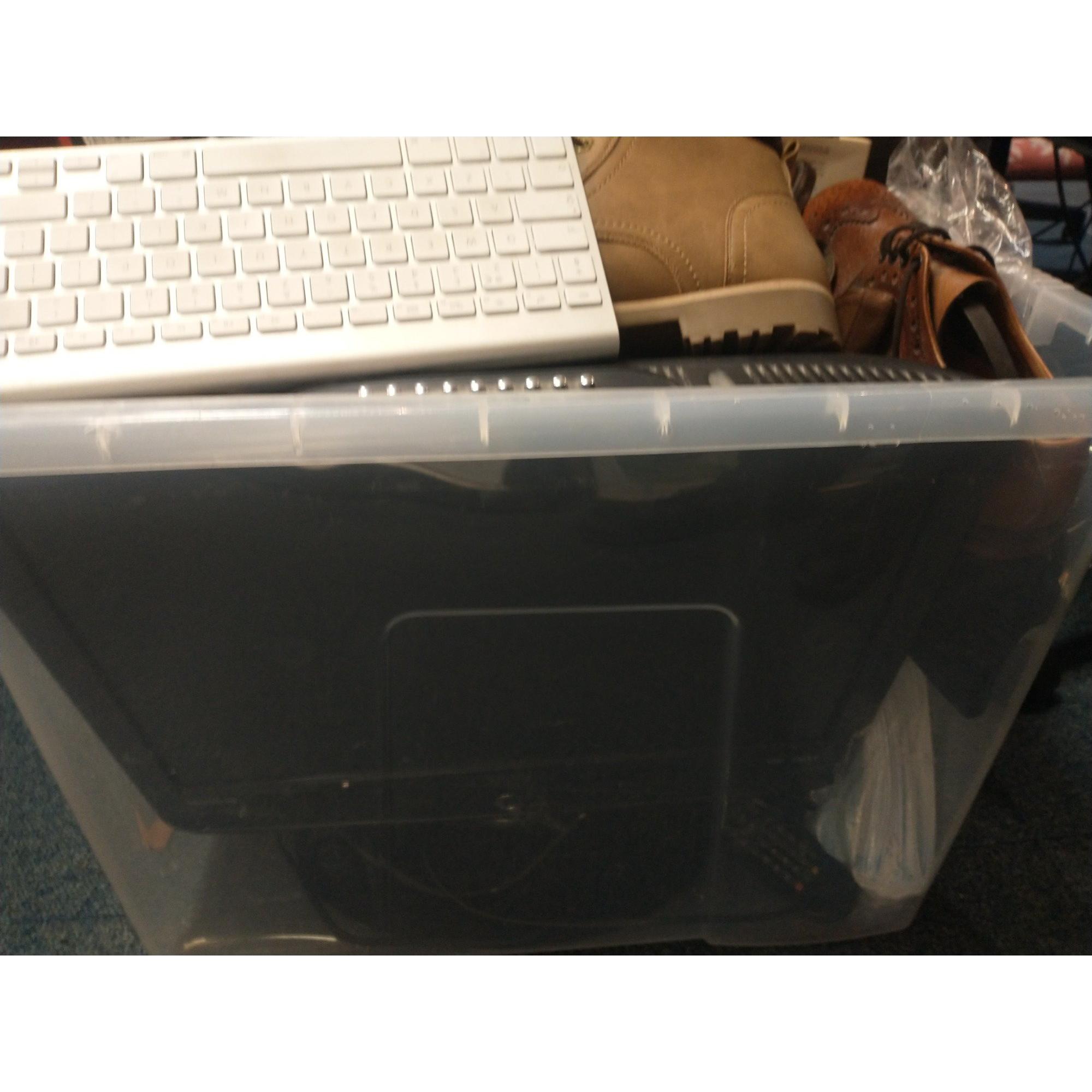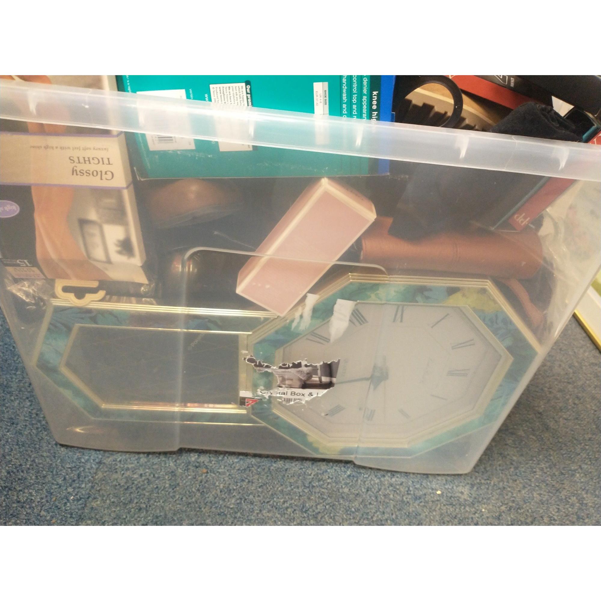 A mixed box to include a small stereo, a tv screen and a collection of shoes.