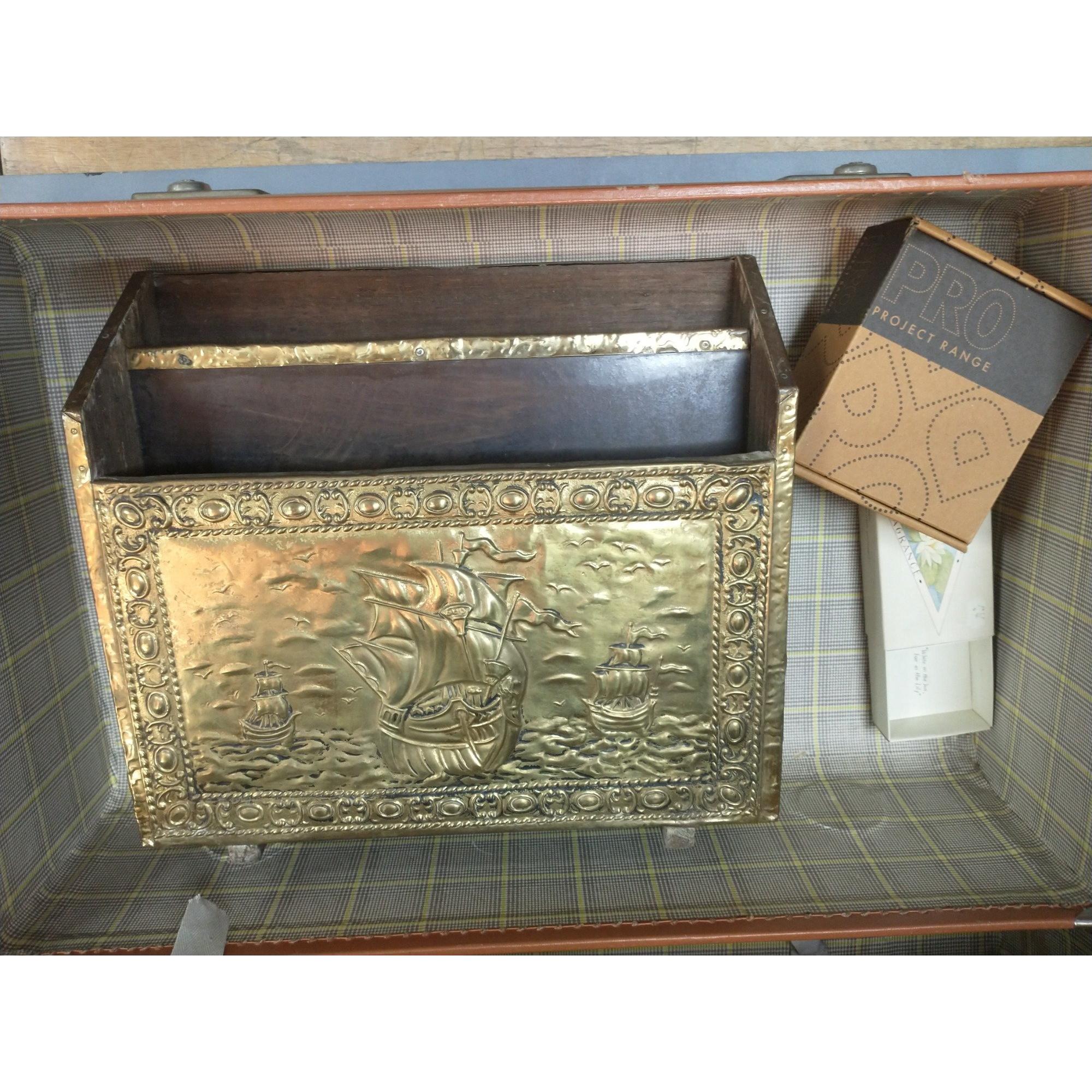 Three vintage cardboard suitcases (65 x 42cm, 50 x 30cm and 60 x 35cm approx) with contents of a brass magazine rack, and set of taps.Approx 3 pieces