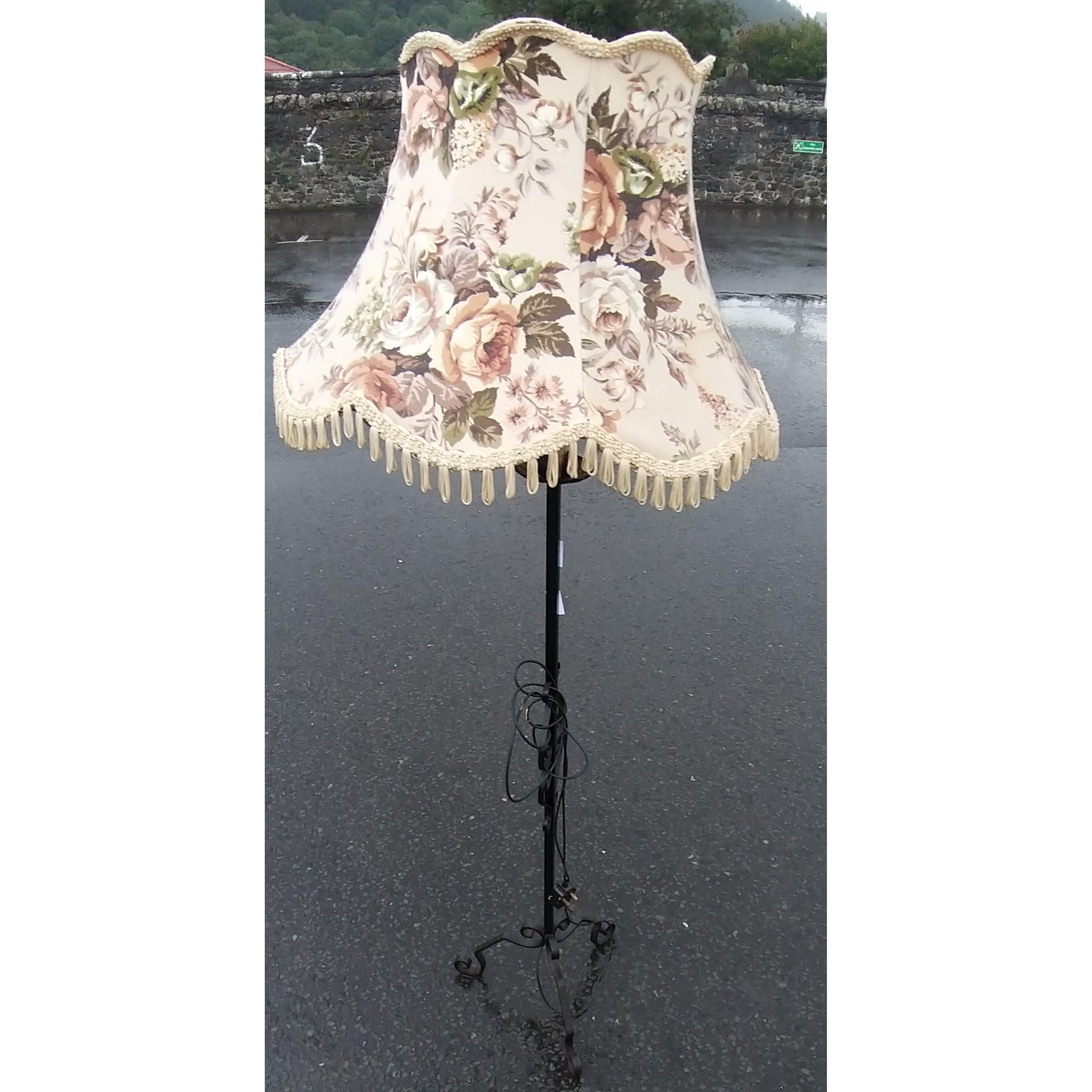 A wrought iron standard lamp in good condition. Electrified, with a modern shade. Stands 159cm approx.