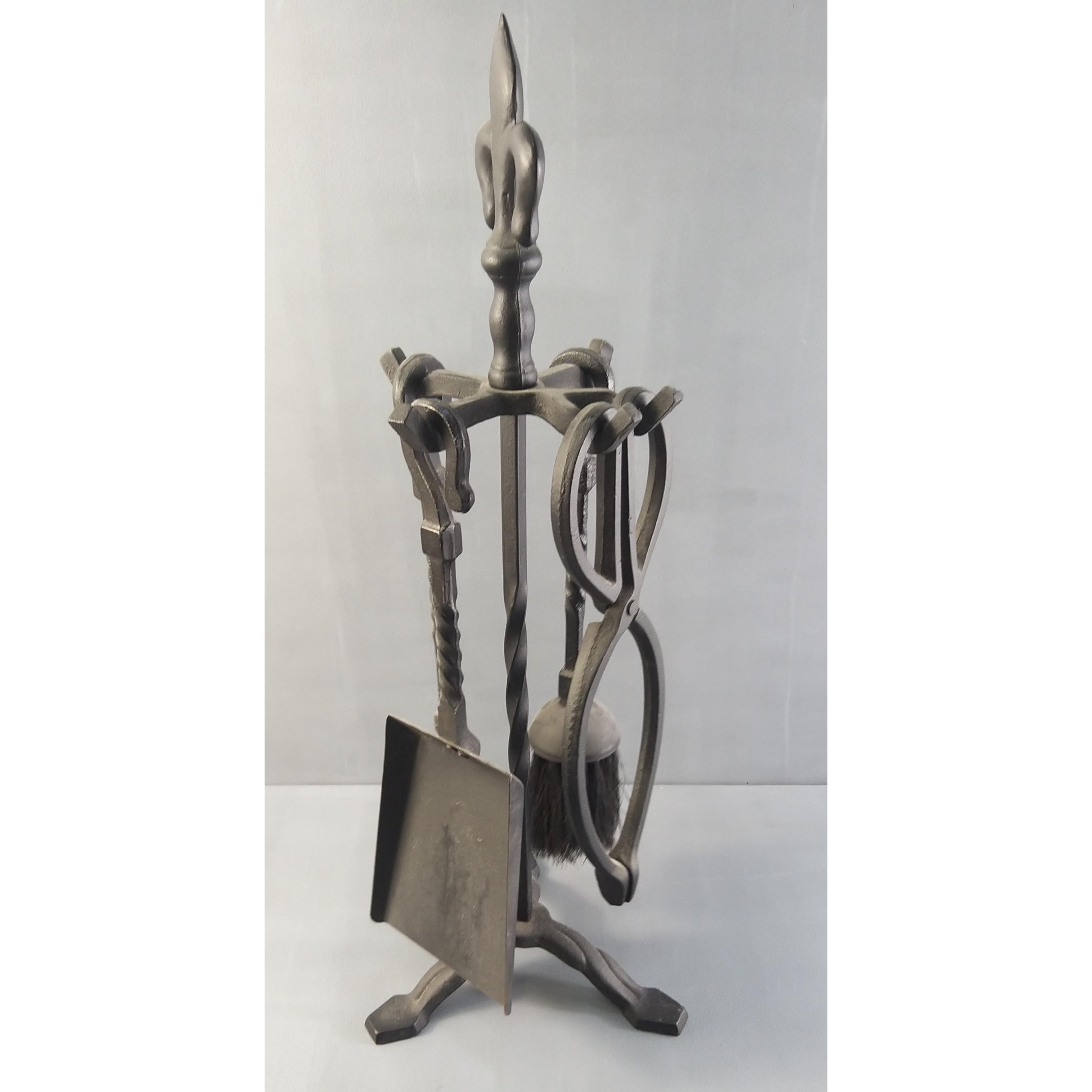 A black cast metal companion set with poker, brush, shovel and tongs. In good decorative and useful condition. Approx 53cm tall to top of fleur-de-lys finial.